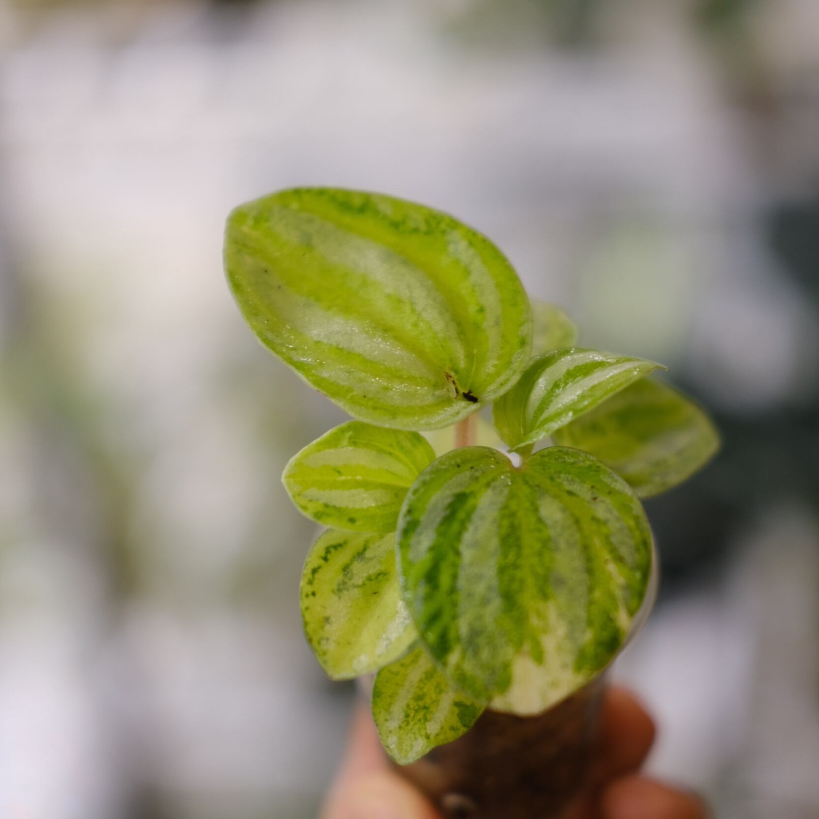 Peperomia argyreia 'Variegated' は、スイカペペロミア(Peperomia argyreia)の斑入り品種で、葉の模様が通常のスイカ模様に加えて、煌びやかに光るミント色の斑入りの非常に美しい観葉植物です。海外のコレクターから特別に仕入れた希少品種で、恐らく国内では初の展開になるかと思います。