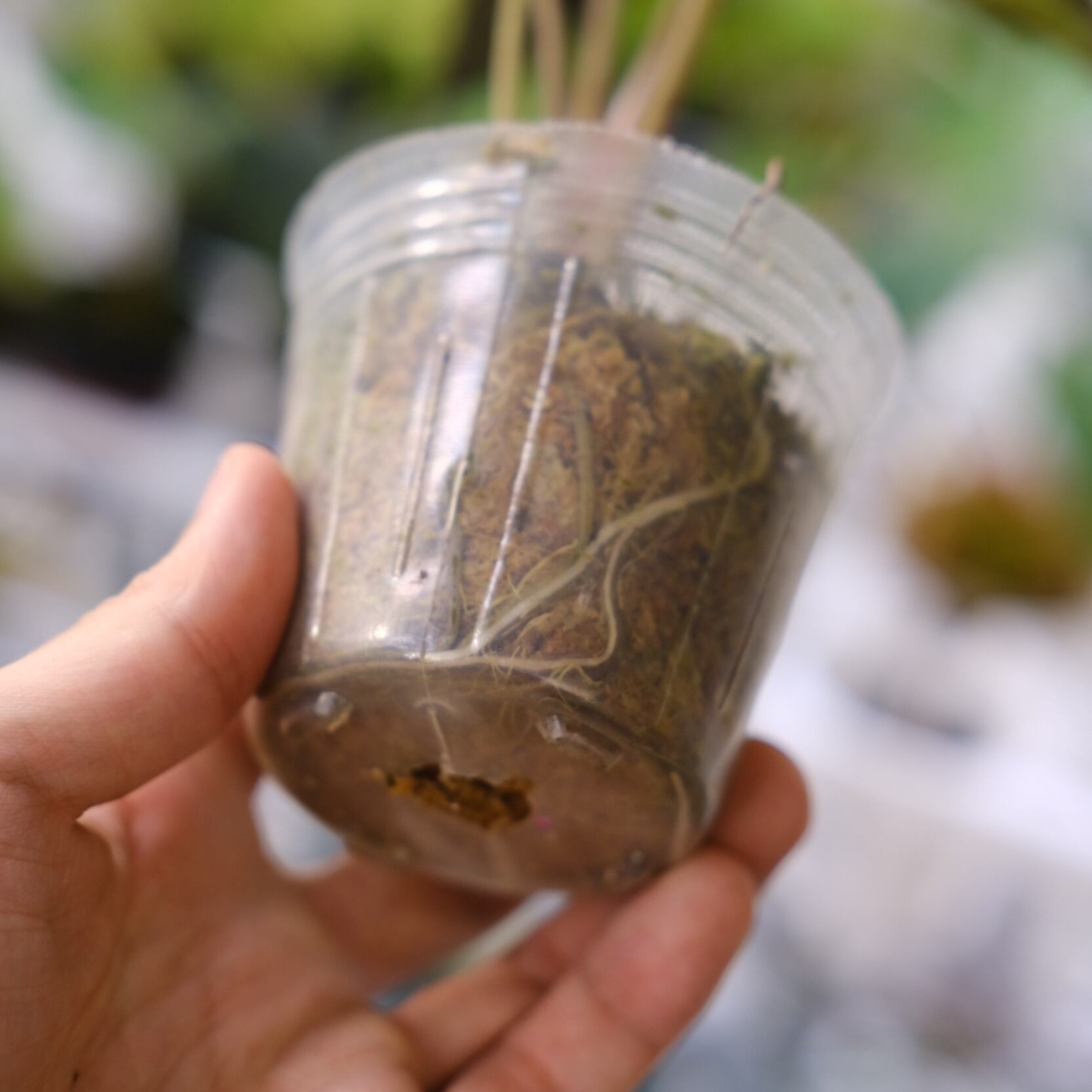 鉢は成長した植物の根を観察できるプラスチック鉢となり、生育に適した【水苔】を用土としています。