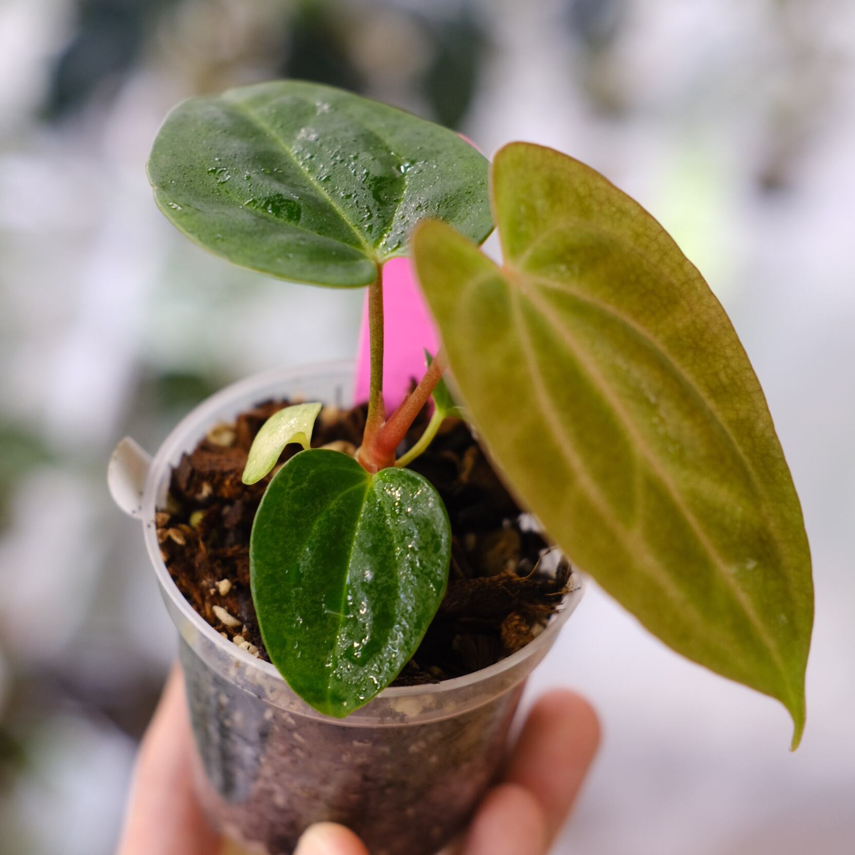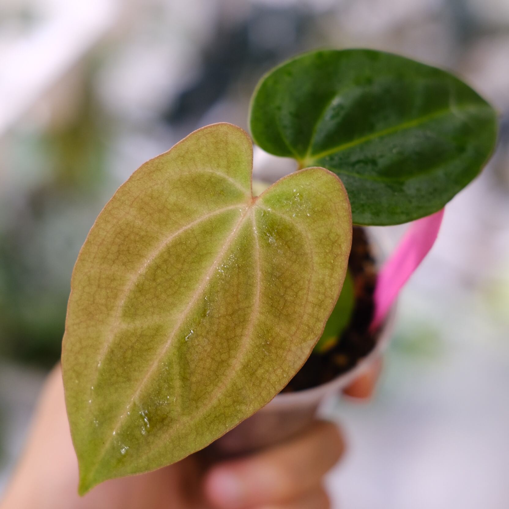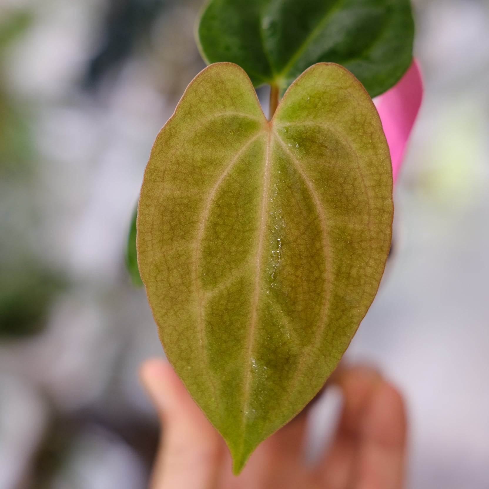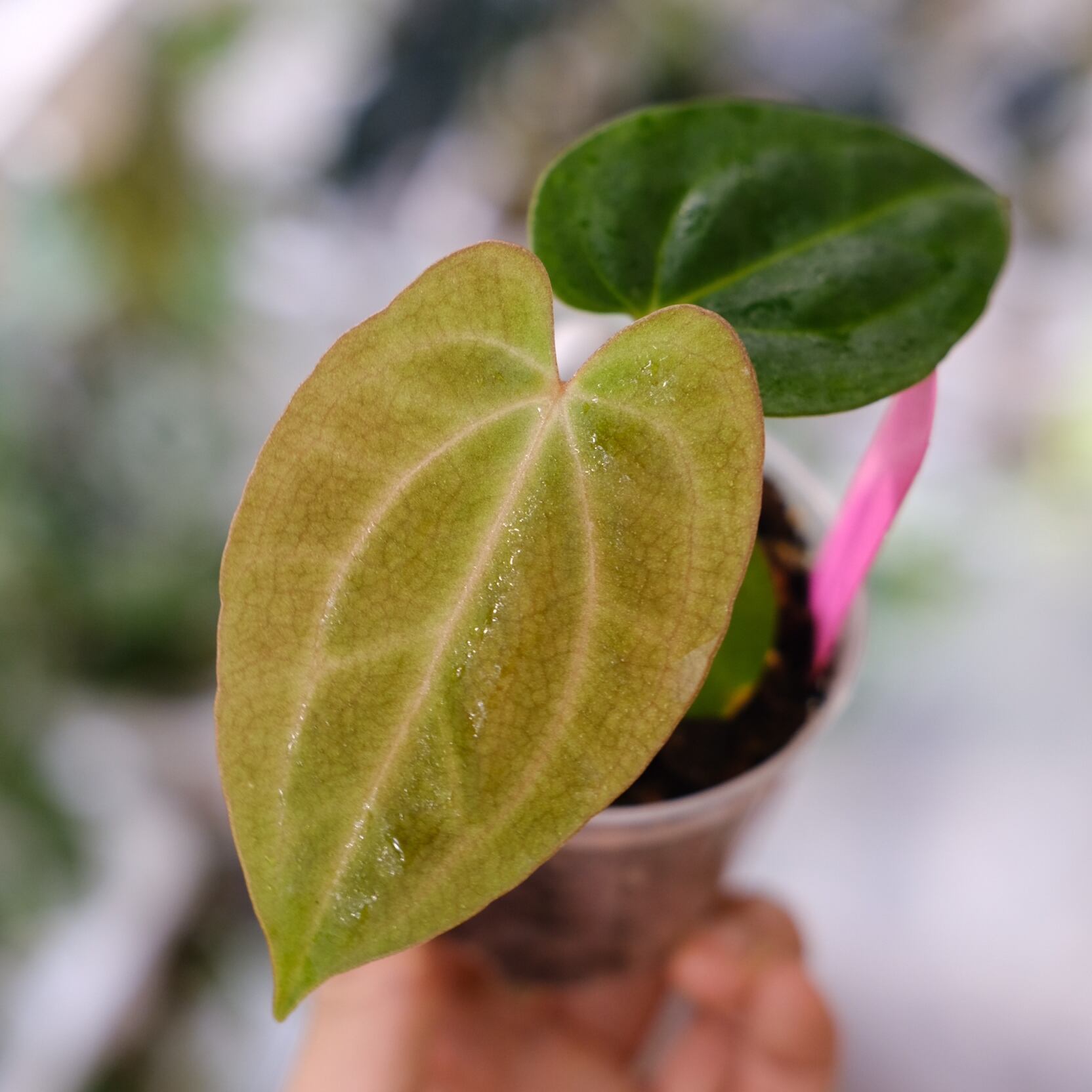 深みのある光沢を持ったハート型の葉にシャープな葉脈が入った姿が美しい、アンスリウム カーラブラッキアエの実生株です。いま世界中で最も注目を集めているアンスリウムの原種といっても過言ではない希少な種です。