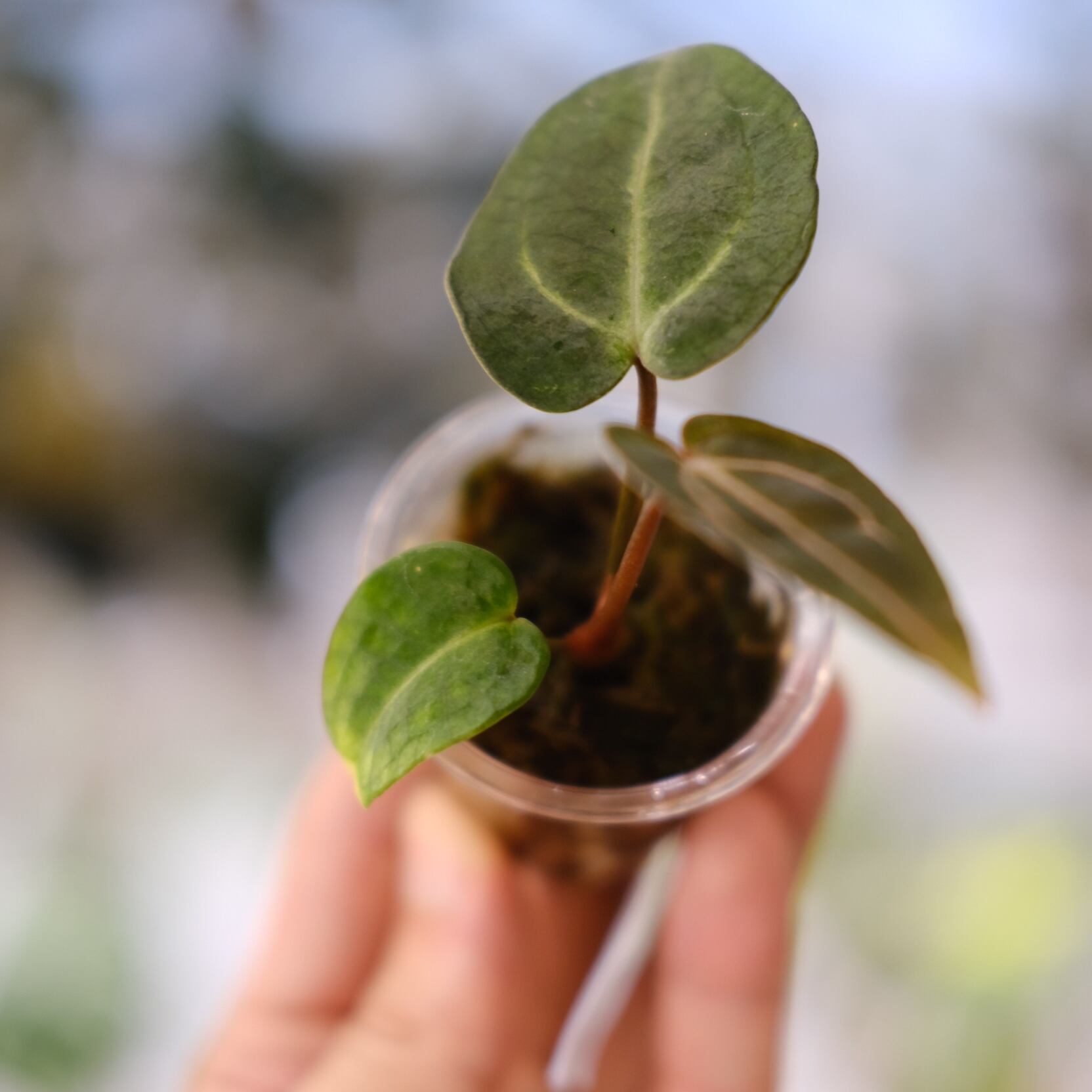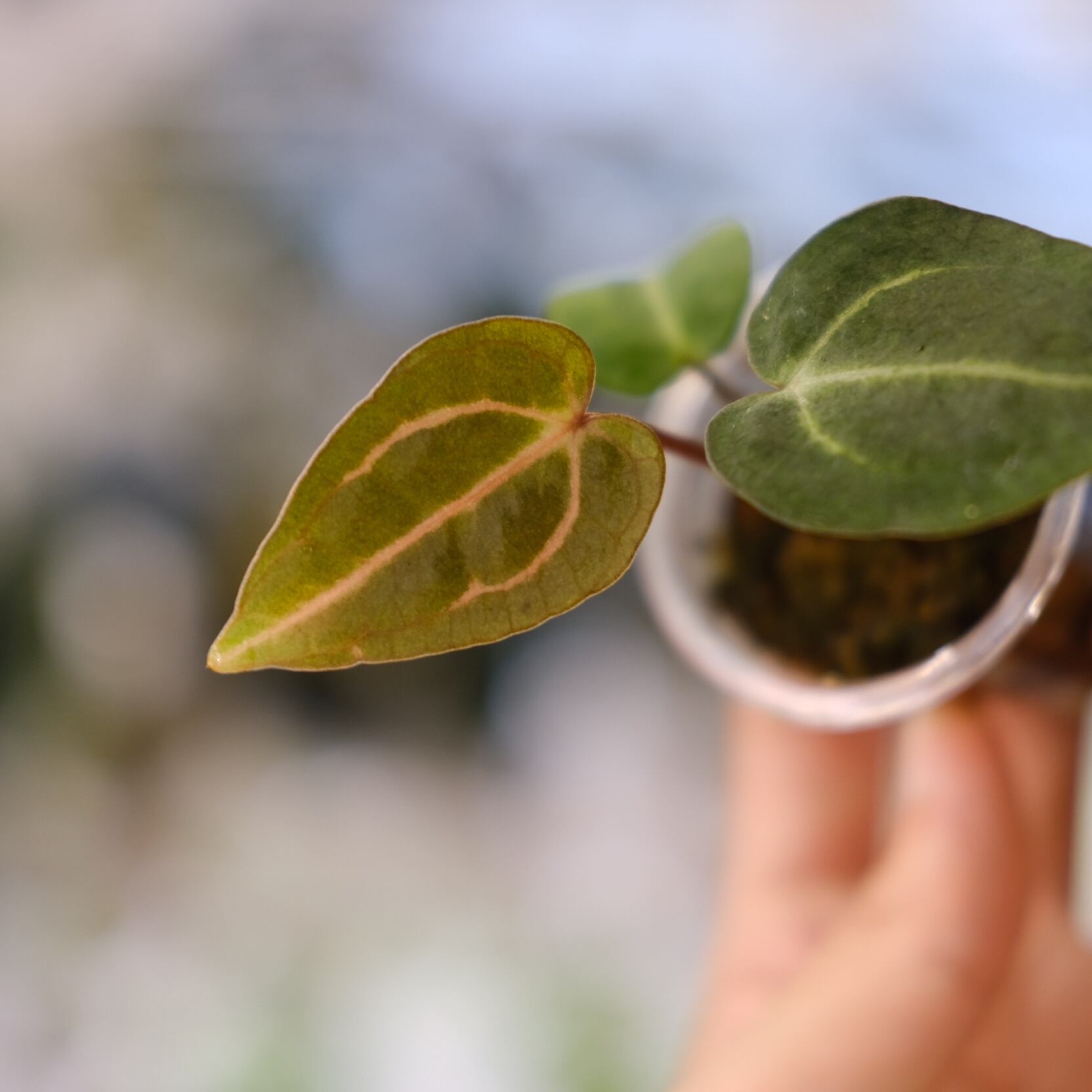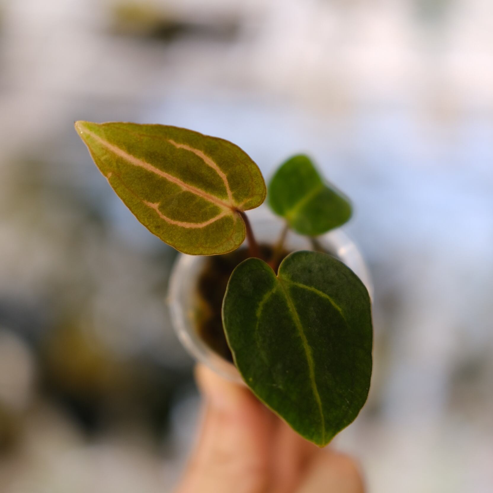 深みのある光沢を持ったハート型の葉にシャープな葉脈が入った姿が美しい、アンスリウム カーラブラッキアエの実生株です。いま世界中で最も注目を集めているアンスリウムの原種といっても過言ではない希少な種です。