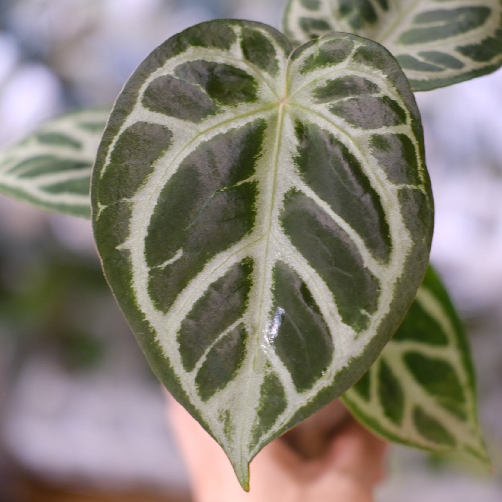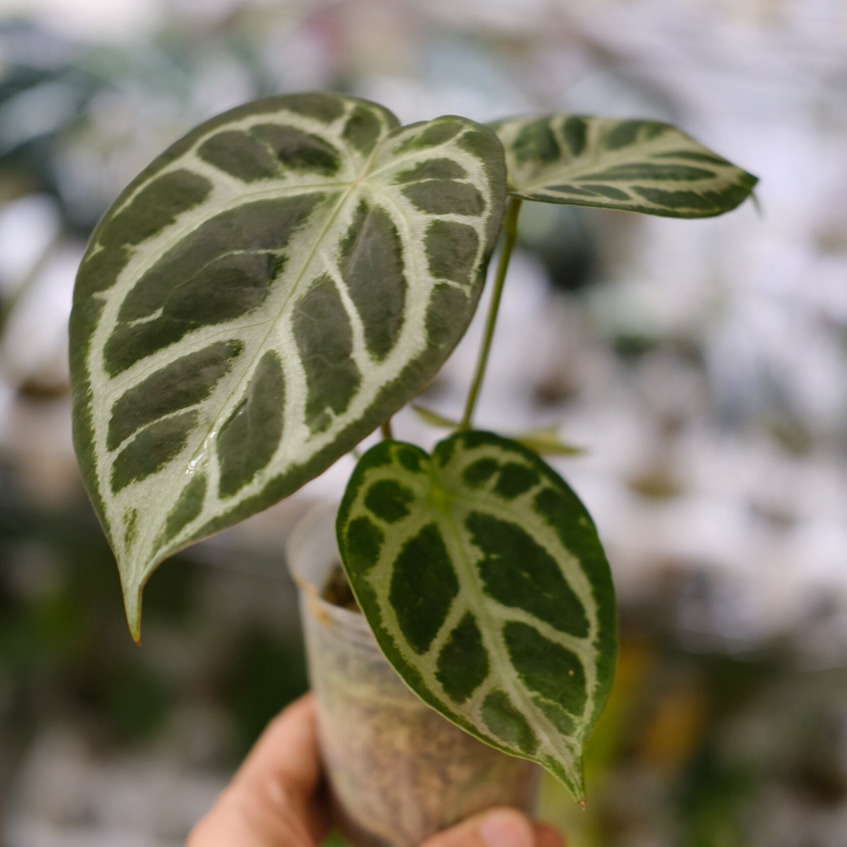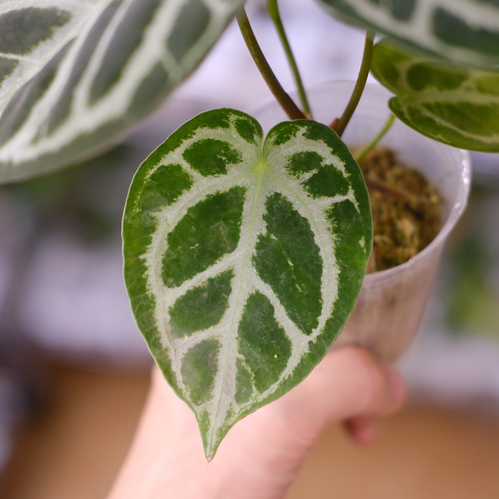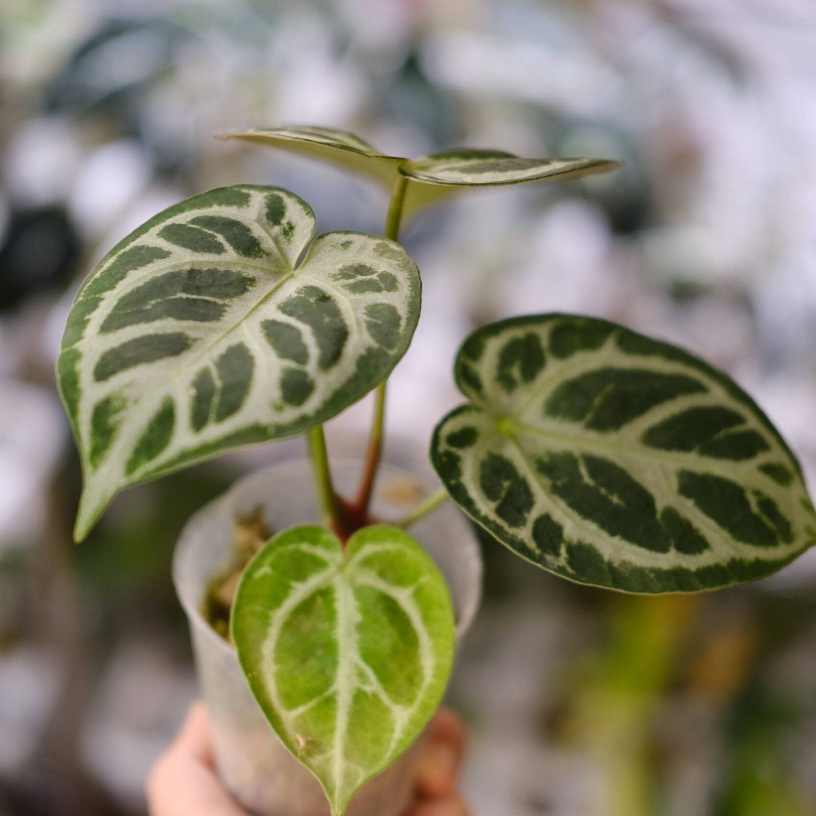 Anthurium Red Crystallinum × Anthurium Silver Blush の希少なハイブリッドです。銀白色の葉脈が深みのある赤色の葉に走る美しい個体です。 レッドクリスタリナムの新葉の展開時に赤みが強く出る特徴を引き継いでいます。