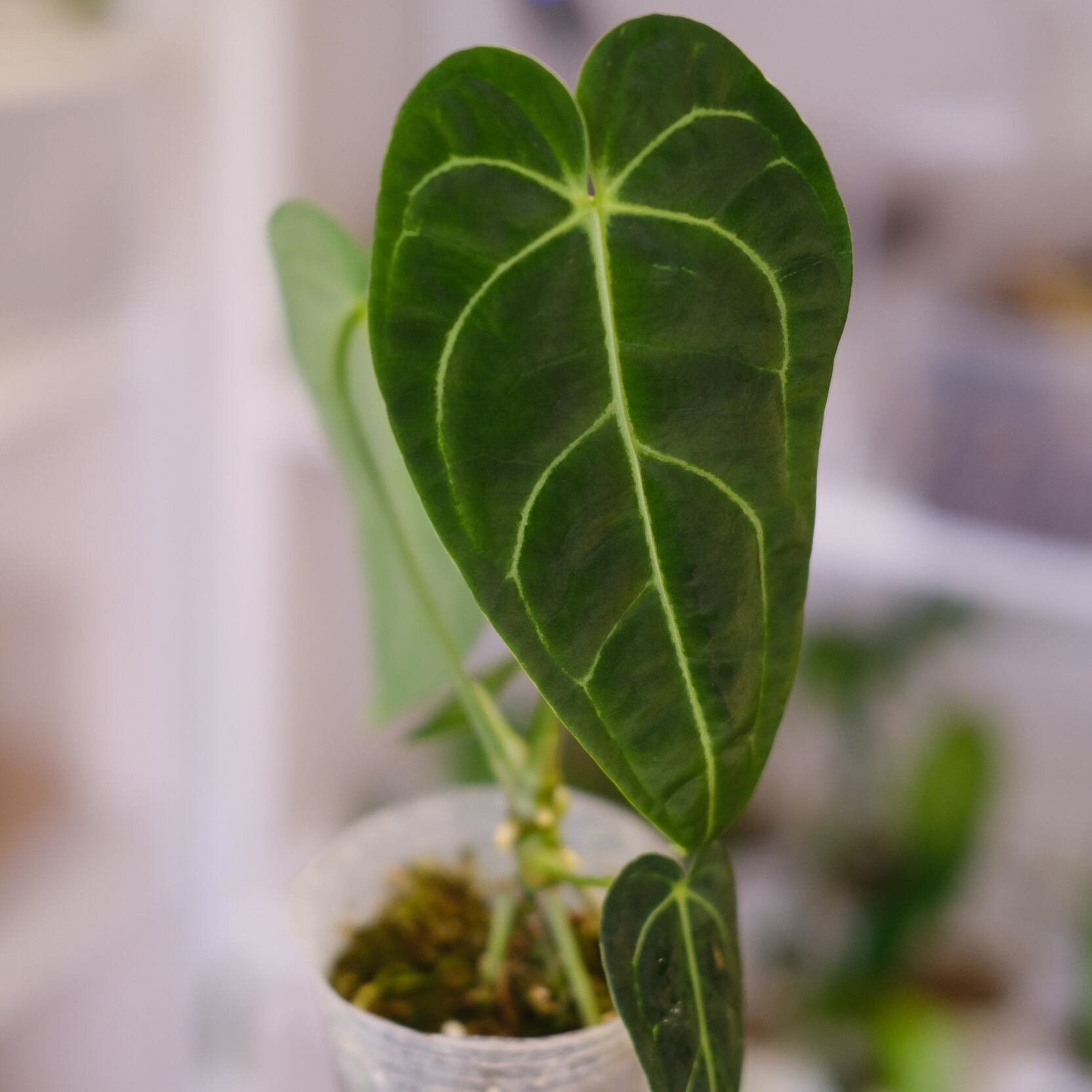 品種改良をされていない原種のアンスリウムです。アンスリウムの中でも大きな葉を展開する品種で、美しい葉脈が入ったハート型の葉を展開します。