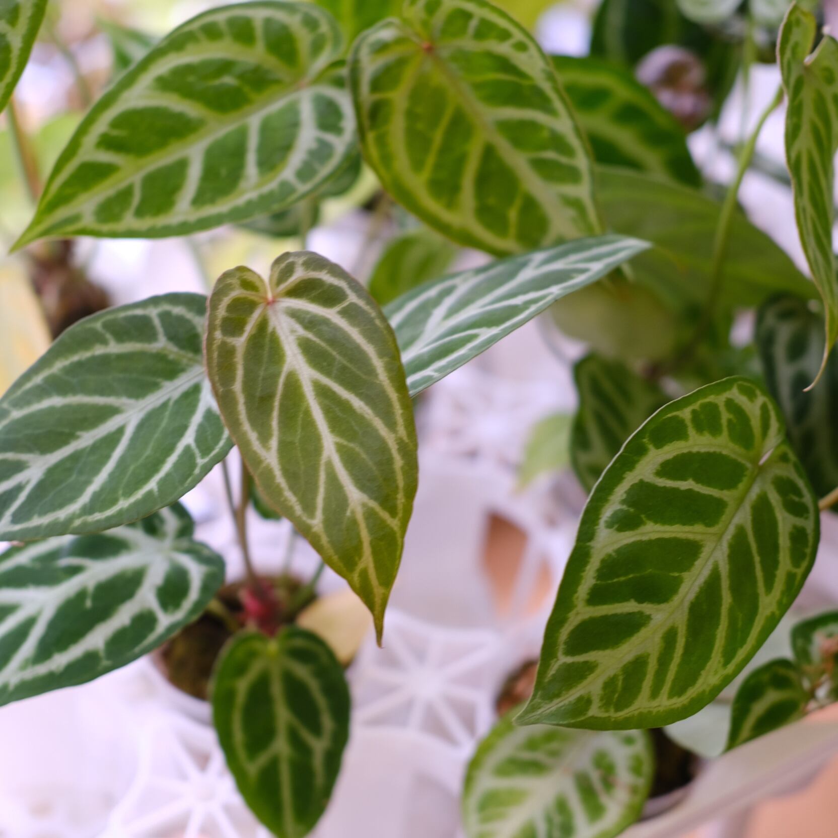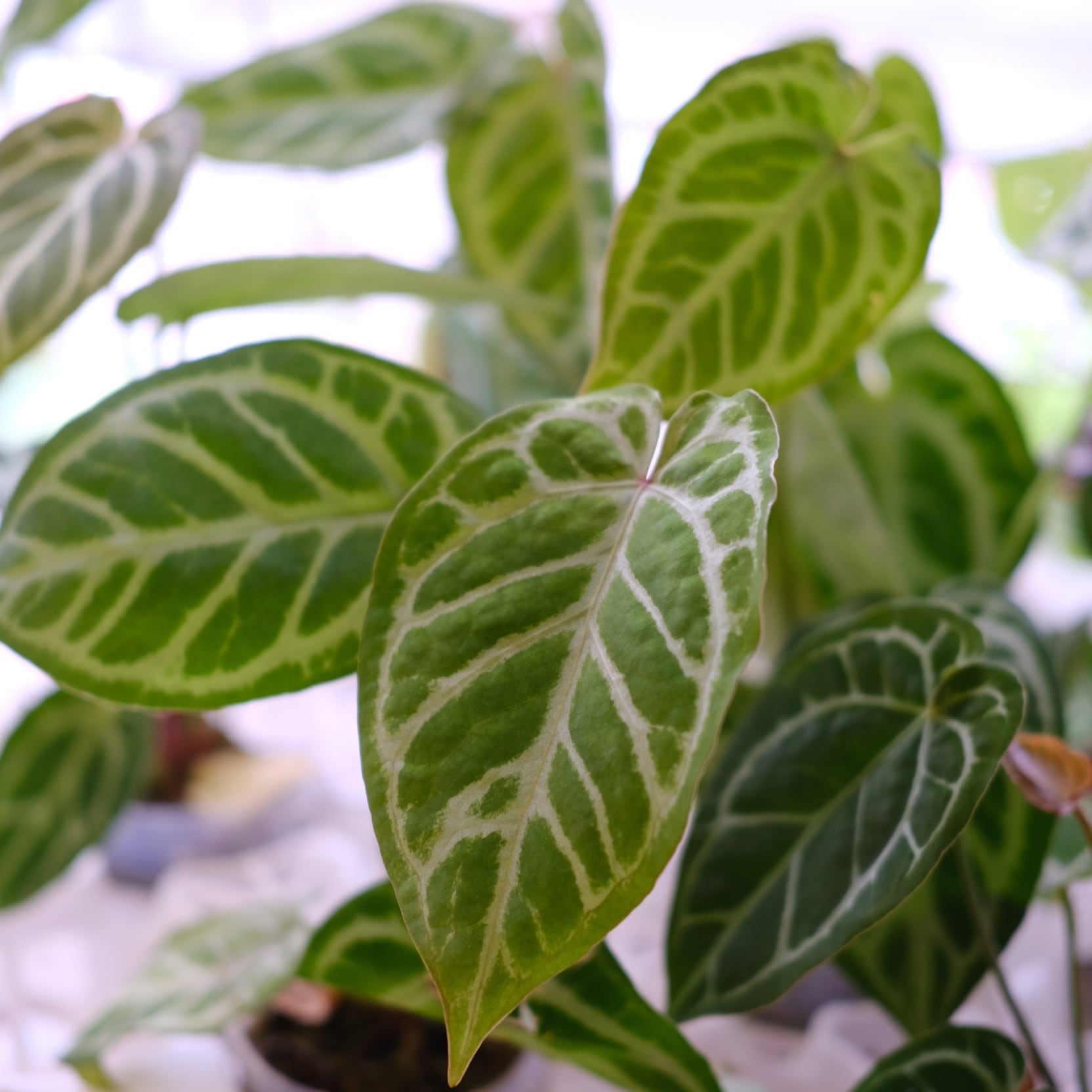 Anthurium Red Crystallinum × Anthurium Silver Blush の希少なハイブリッドです。銀白色の葉脈が深みのある赤色の葉に走る美しい個体です。 レッドクリスタリナムの新葉の展開時に赤みが強く出る特徴を引き継いでいます。