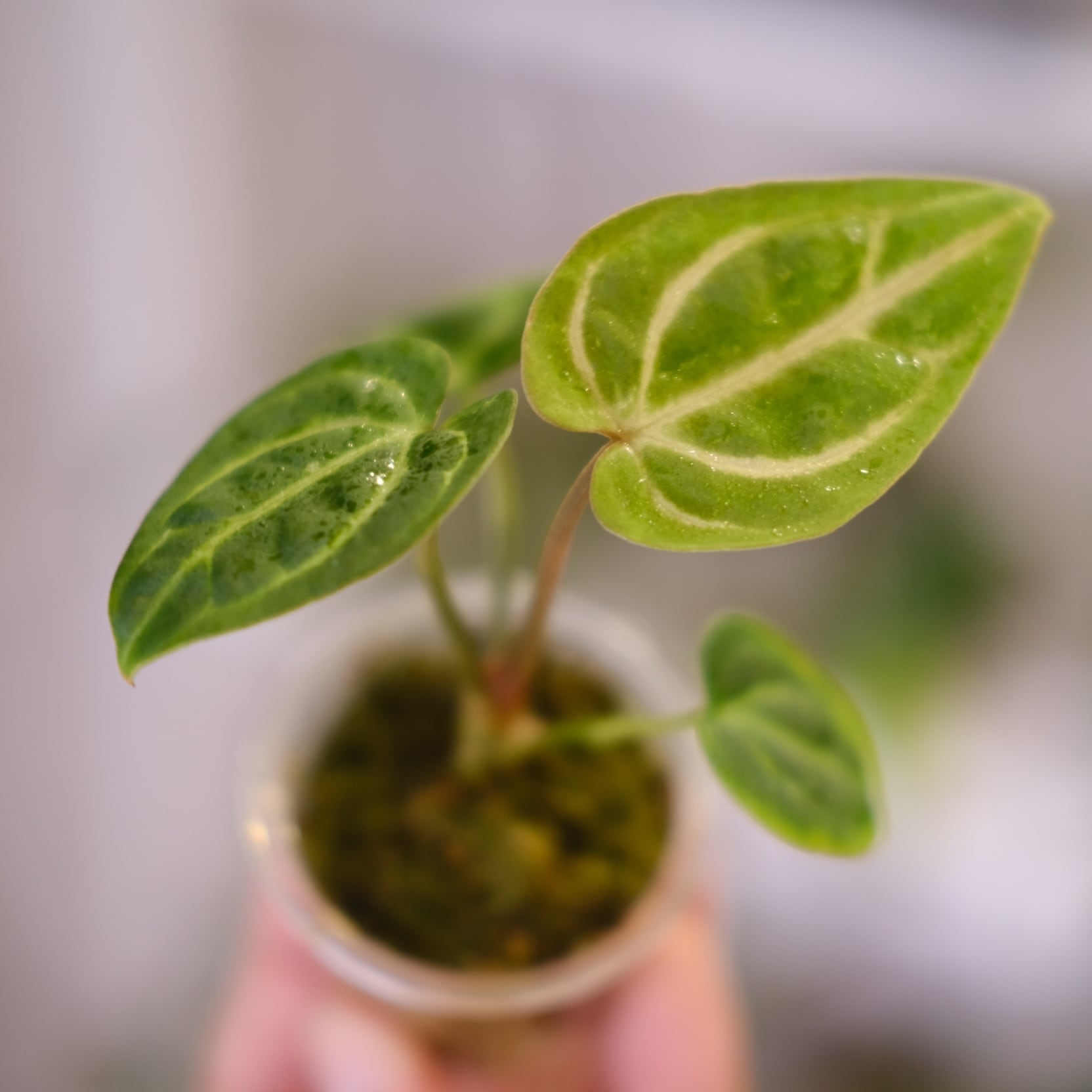 深みのある光沢を持ったハート型の葉にシャープな葉脈が入った姿が美しい、アンスリウム カーラブラッキアエの実生株です。いま世界中で最も注目を集めているアンスリウムの原種といっても過言ではない希少な種です。