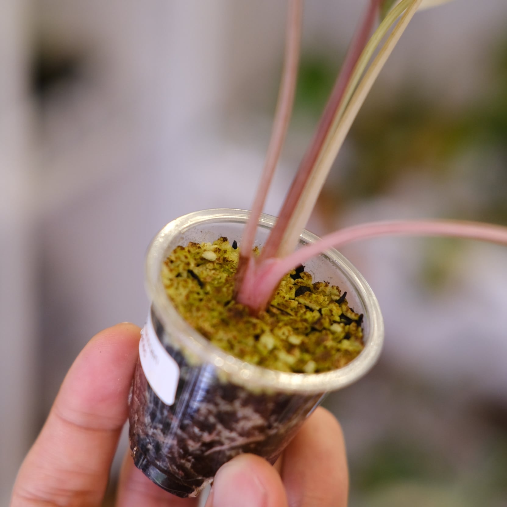 組織培養株を順化後3カ月ほど経過しており、ピンク色の新芽は順化後に展開をしました。
