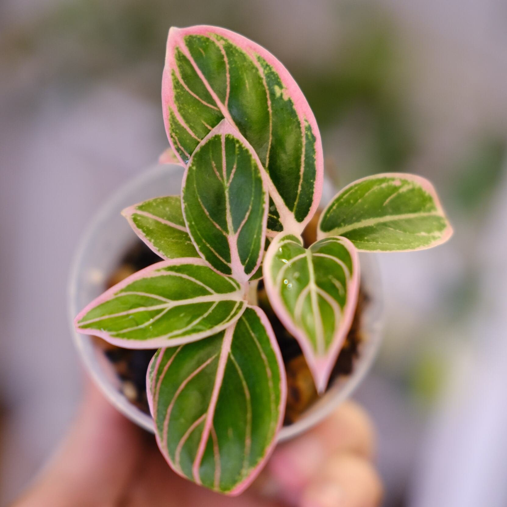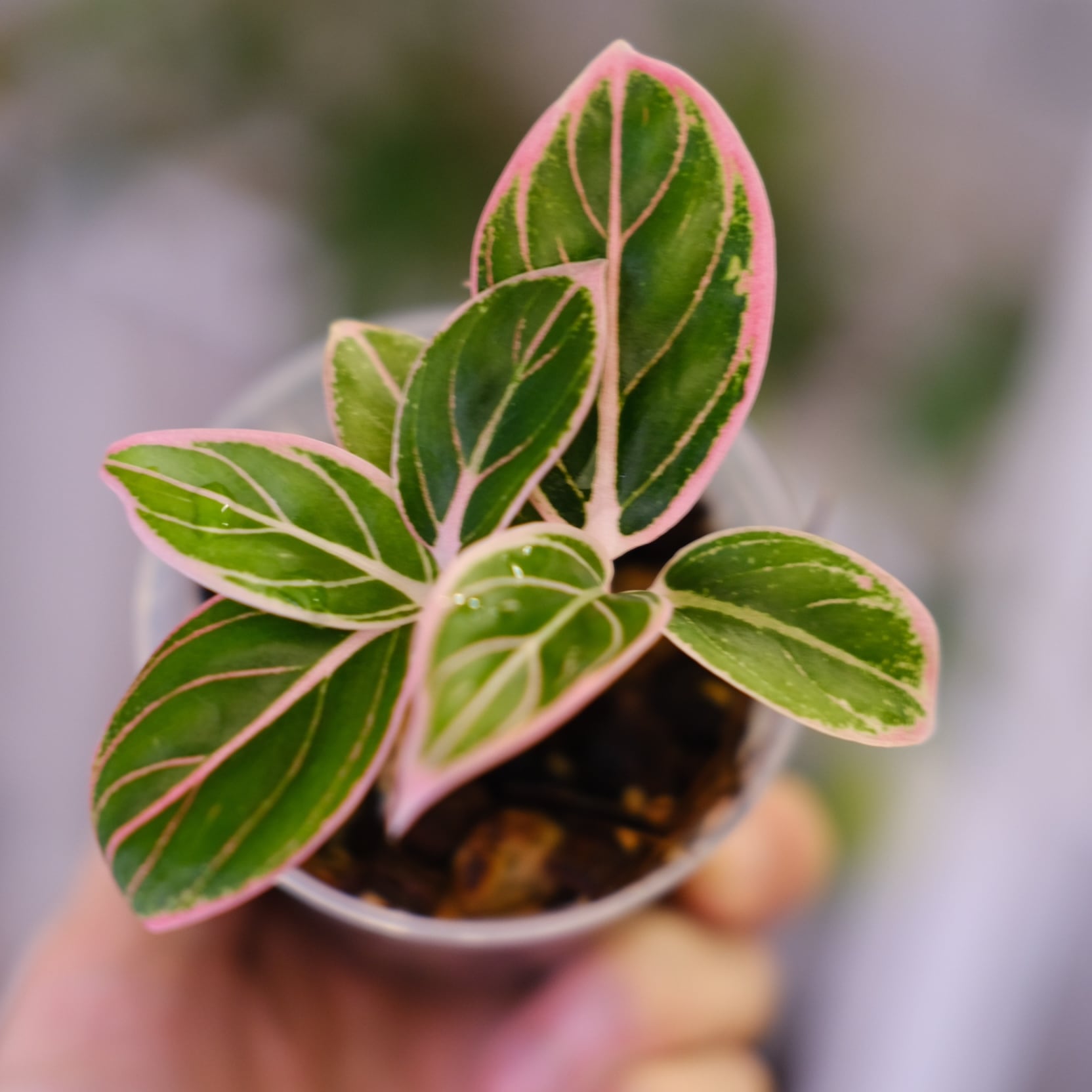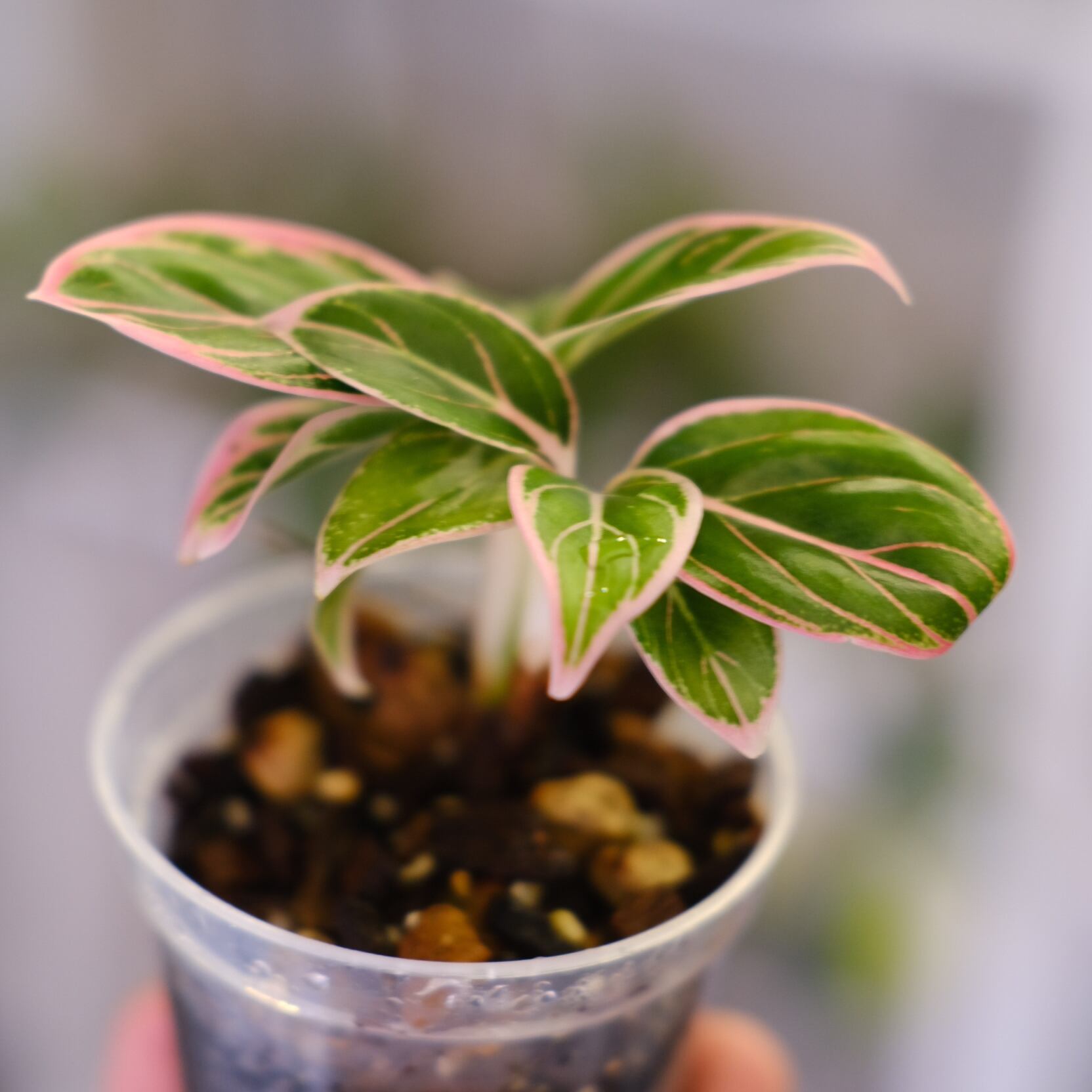 鮮やかなピンク色の葉の縁が可愛い、アグラオネマ ロータス ディライトです。ドワーフタイプの品種のため狭いスペースでも育てることができ、成長するとピンク色がより強くなり鮮やかな葉を楽しむことができますよ。上から見るとまるでロータスの花のようなところから、この名前が付けられました。