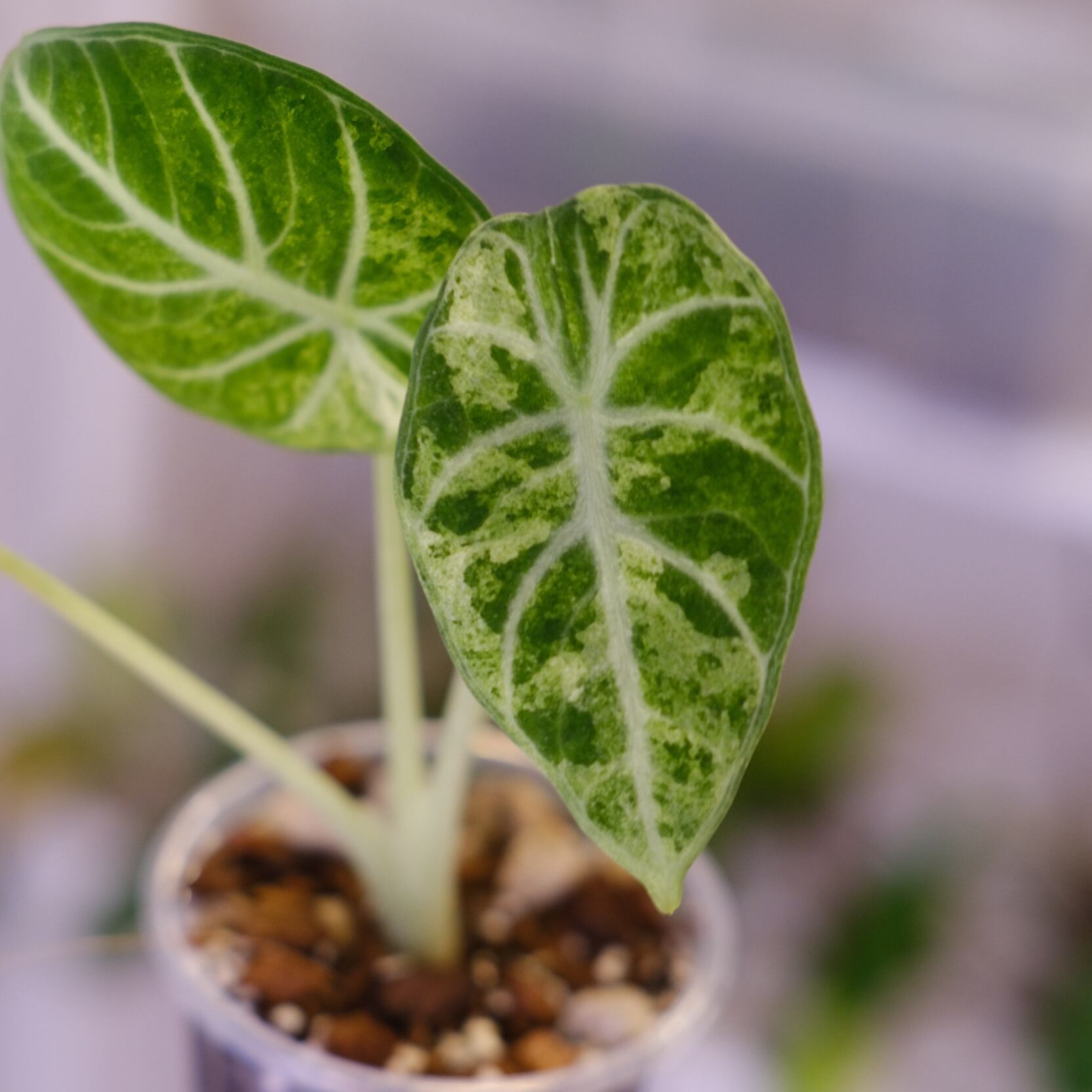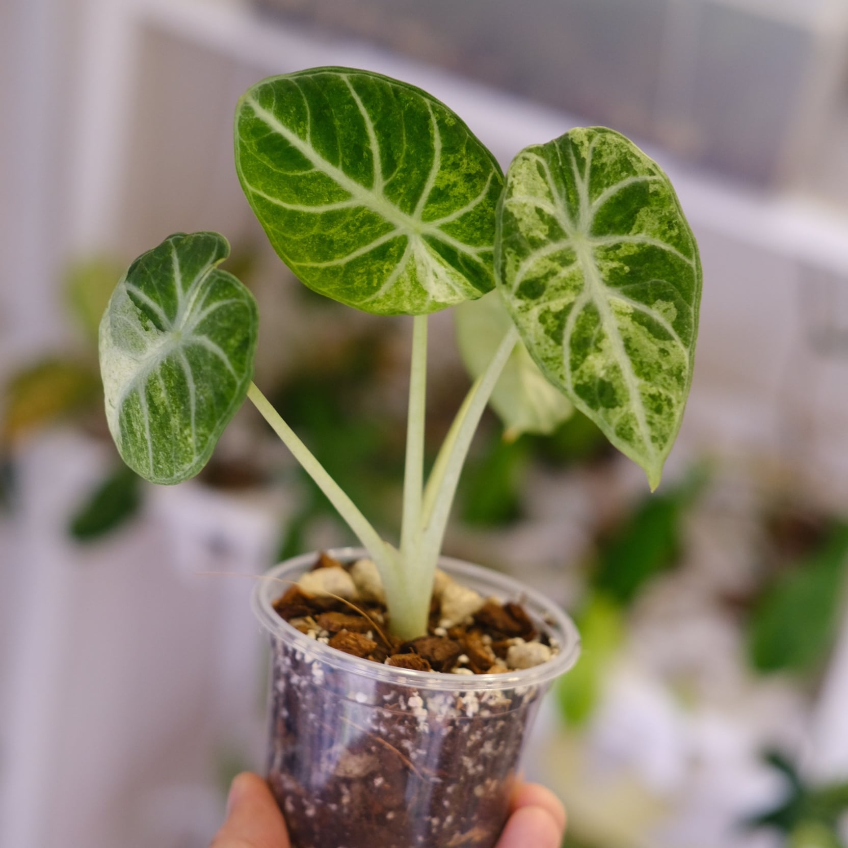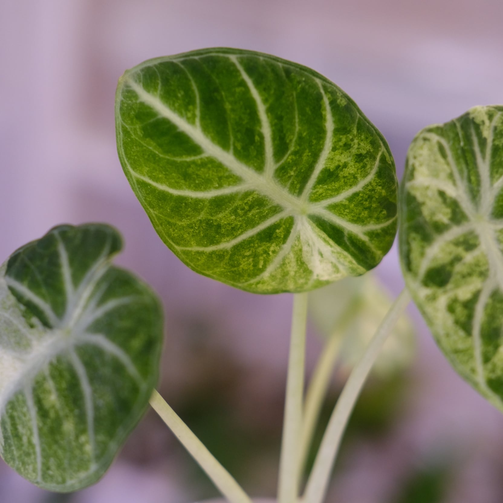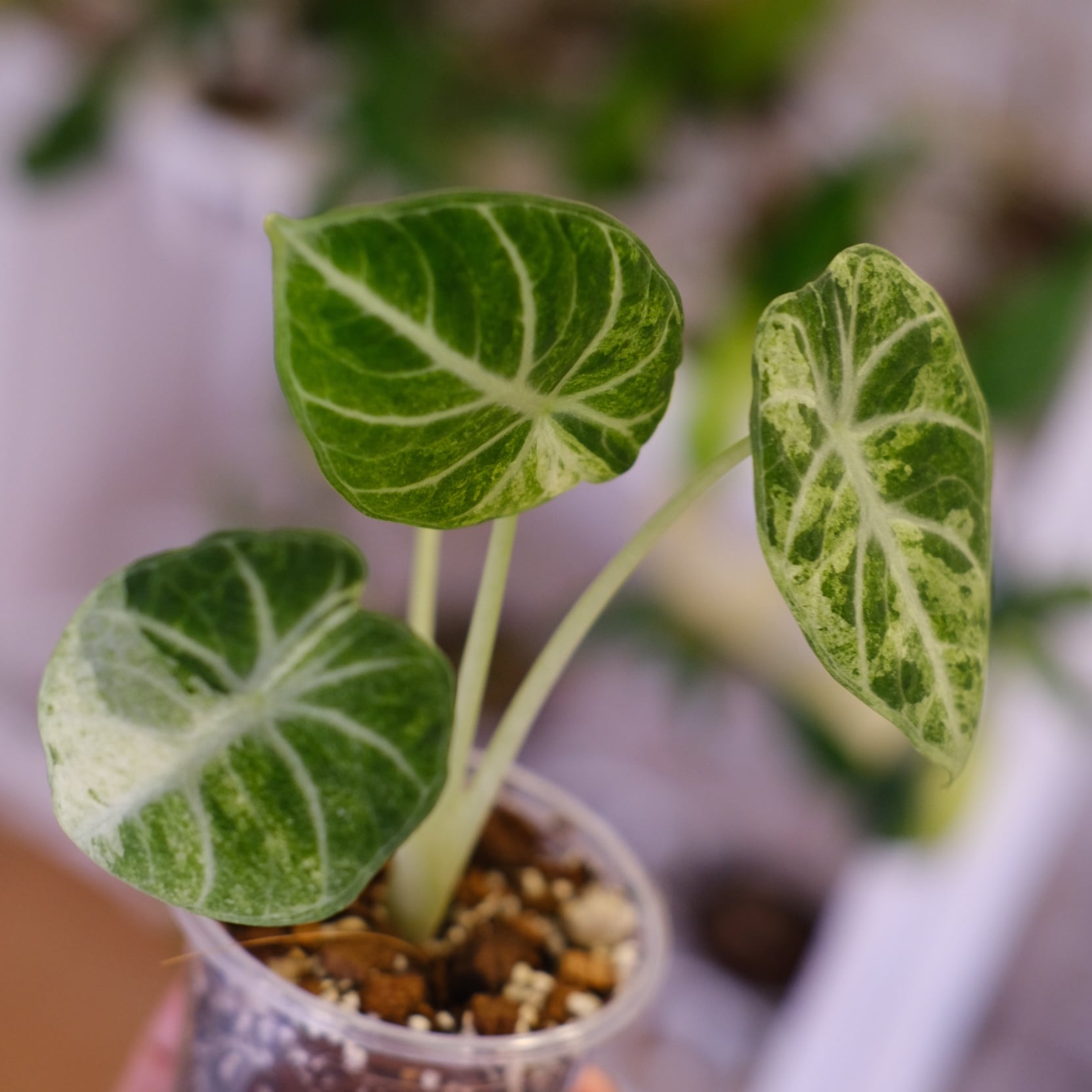 名前の通り、「トリカラー(三色)」の斑が入った葉が最大の特徴で、深い緑の葉に、白〜ピンクの不規則なスプラッシュ模様が入ります。斑の入り方がすべて異なるため、「一点もの」として扱われる希少なアロカシアです。