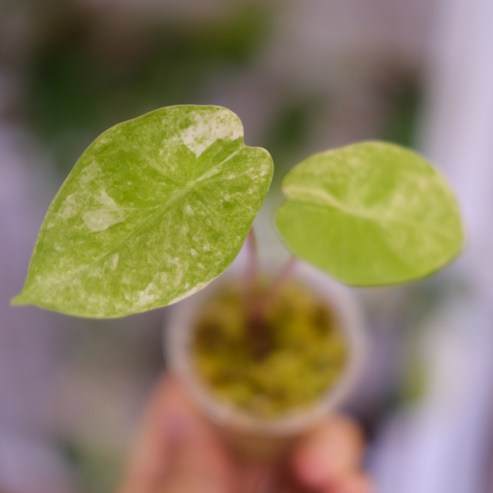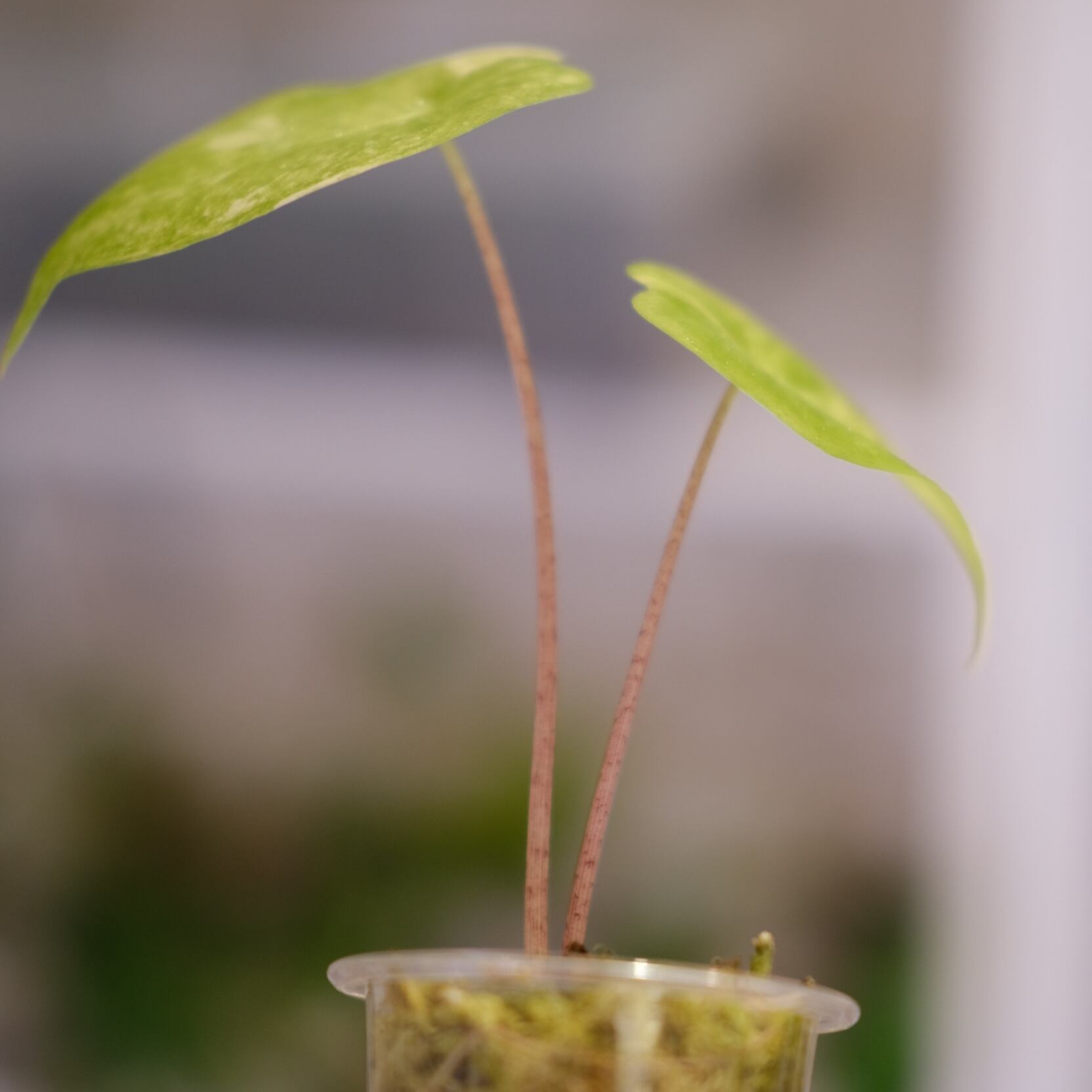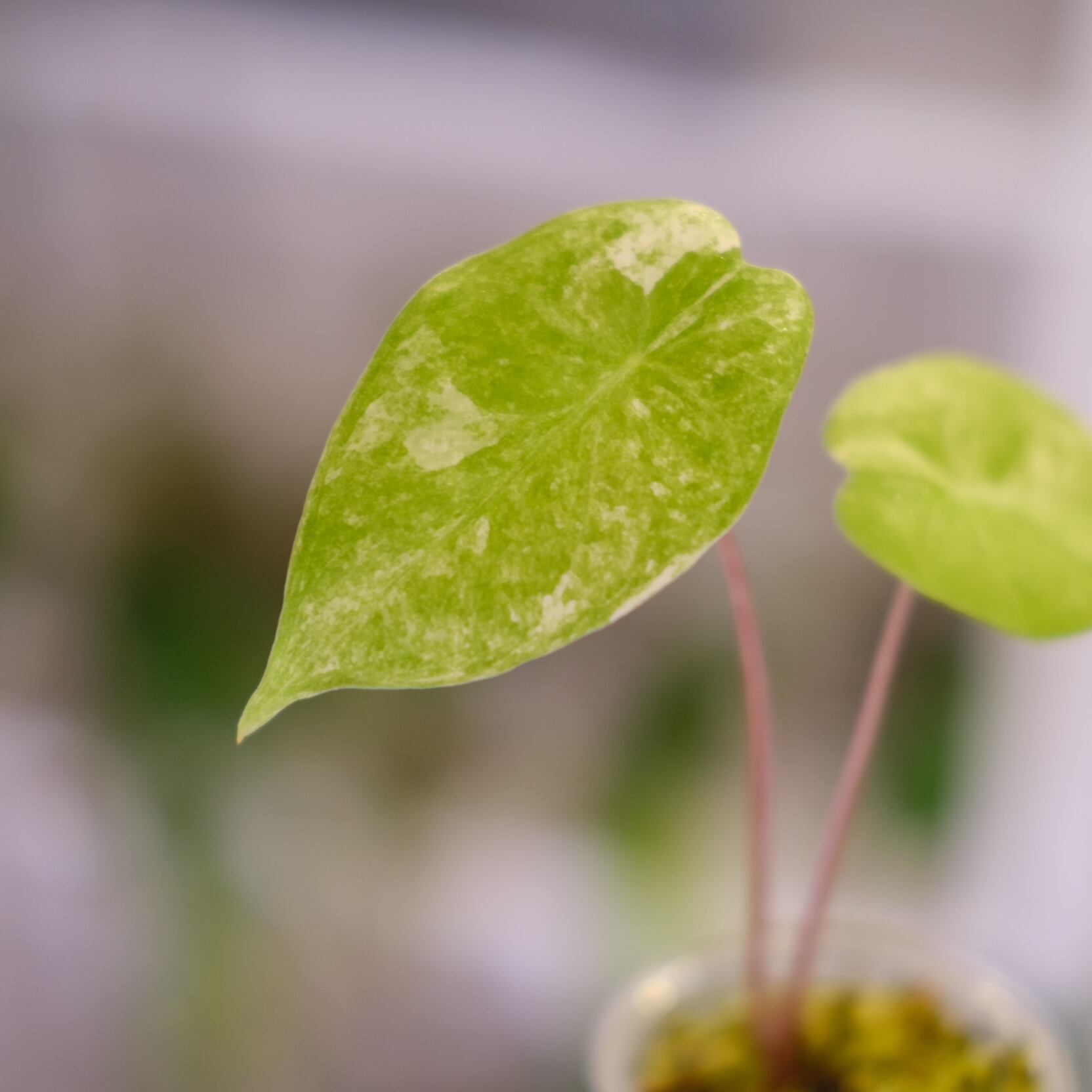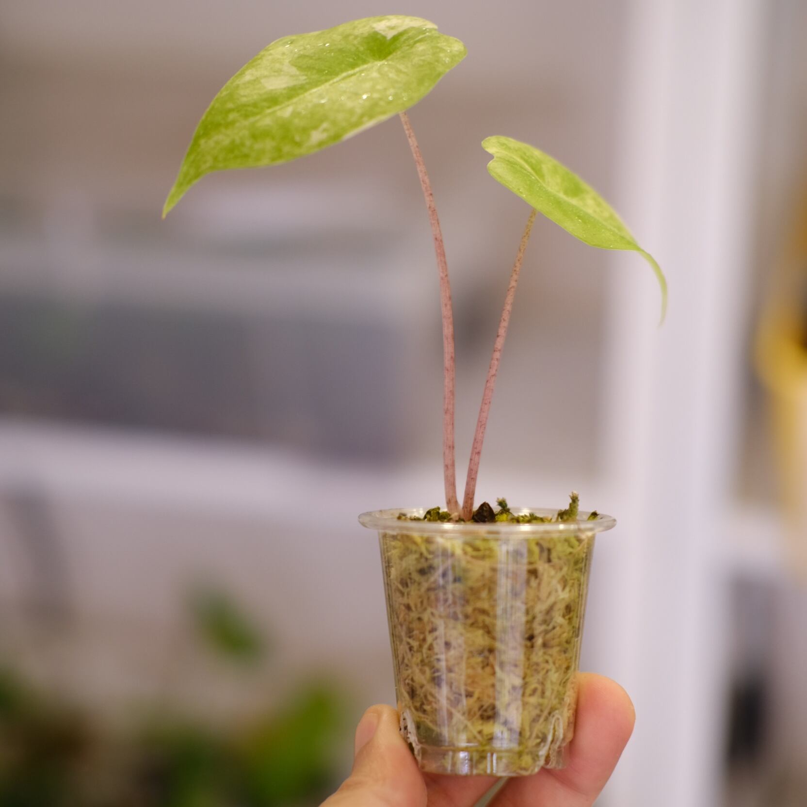 アロカシア ピンク ドラゴンは、希少な斑入りアロカシアの一つで、茎が淡いピンク色をしていることからその名が付けられました。他の斑入りアロカシアよりも繊細な水彩画のような斑が特徴的です。
