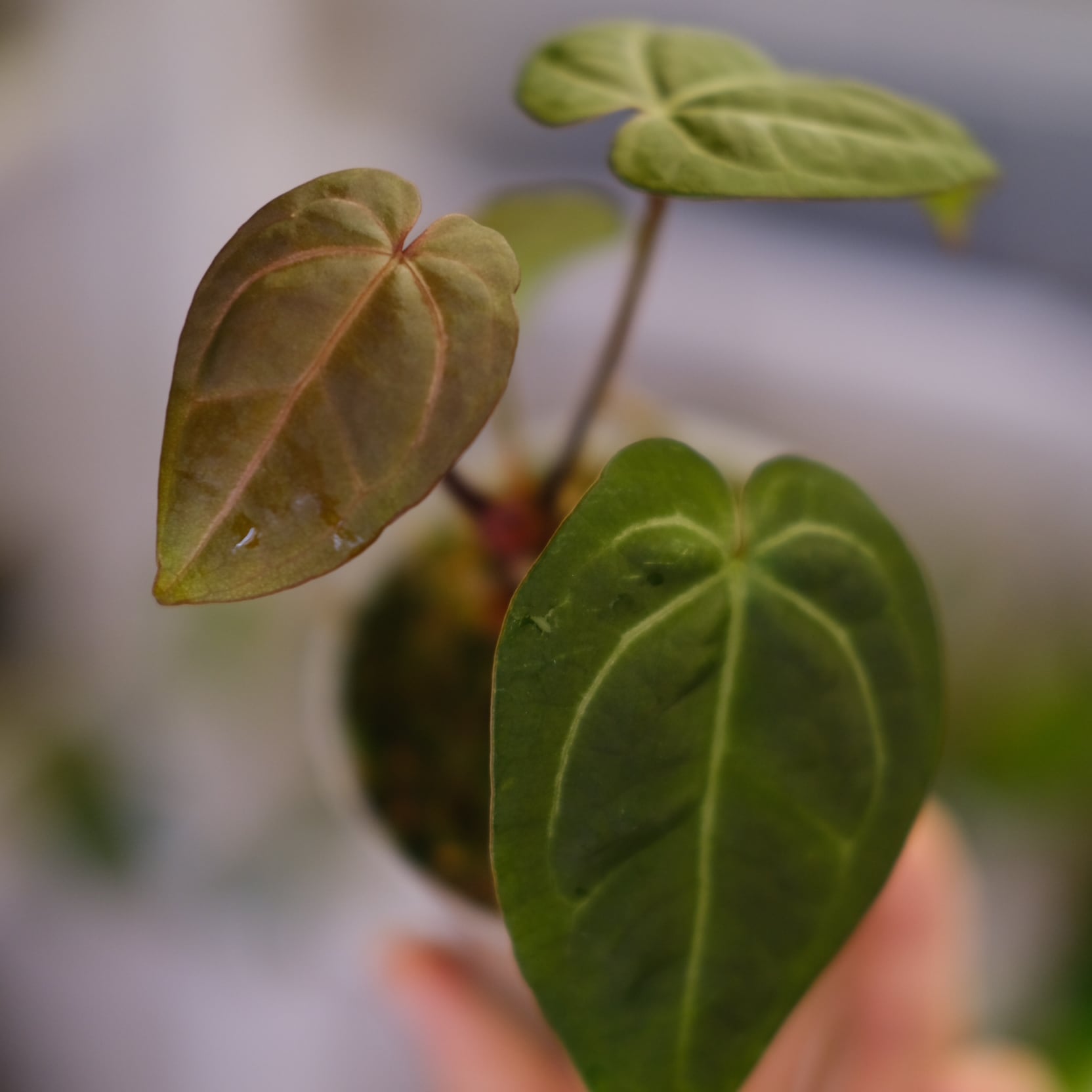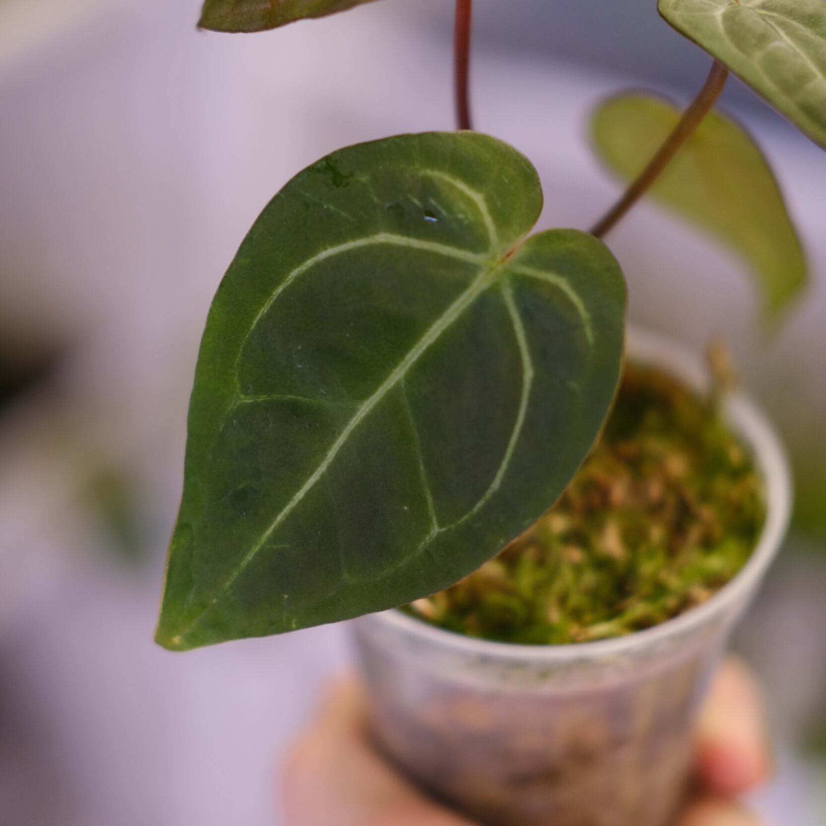 Anthurium Red Crystallinum × Anthurium Silver Blush の希少なハイブリッドです。銀白色の葉脈が深みのある赤色の葉に走る美しい個体です。