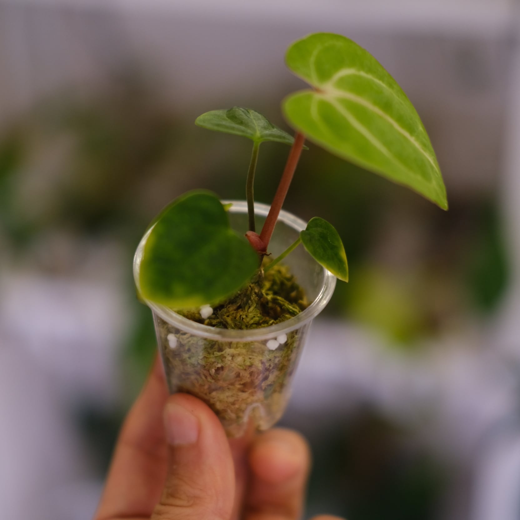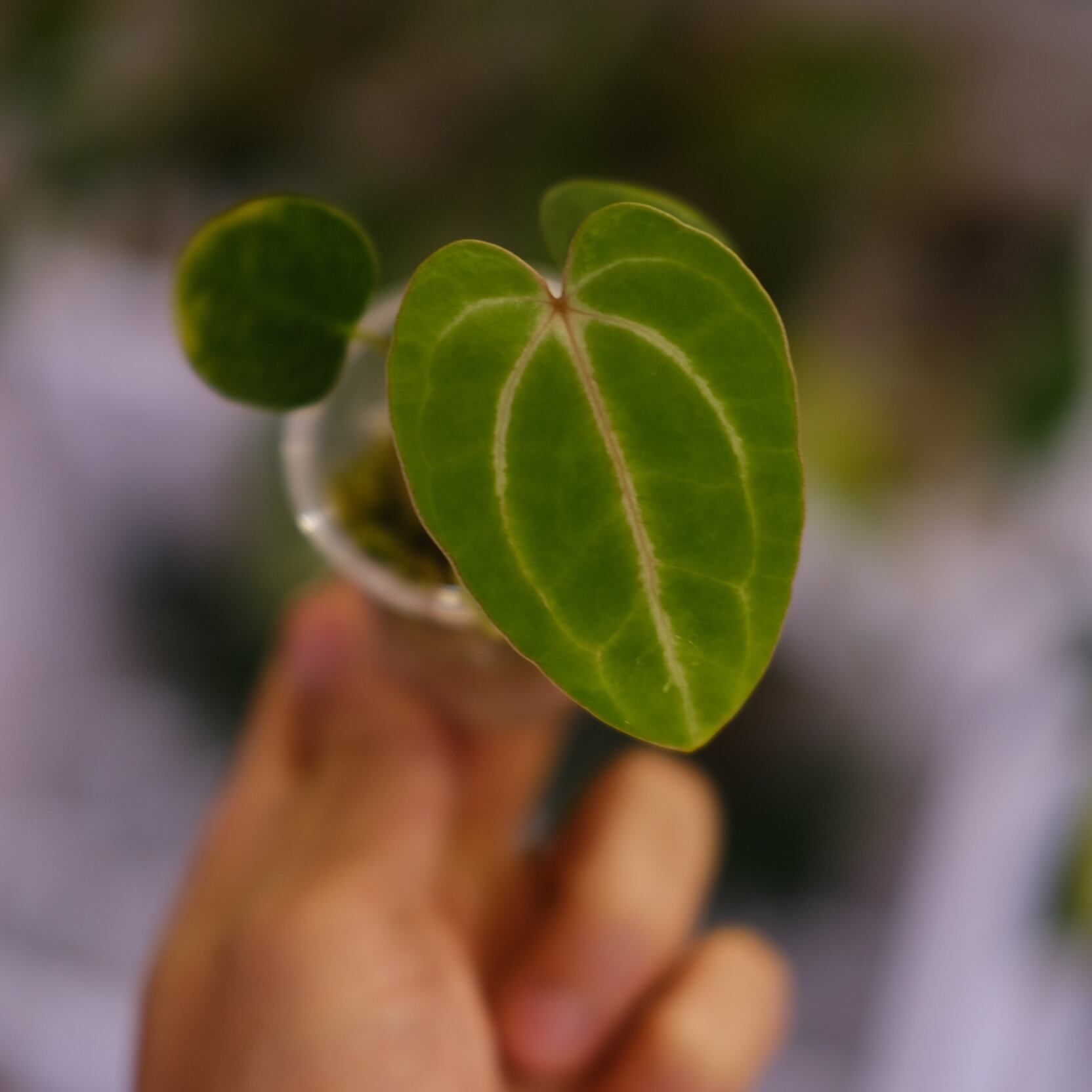 深みのある光沢を持ったハート型の葉にシャープな葉脈が入った姿が美しい、アンスリウム カーラブラッキアエの実生株です。いま世界中で最も注目を集めているアンスリウムの原種といっても過言ではない希少な種です。