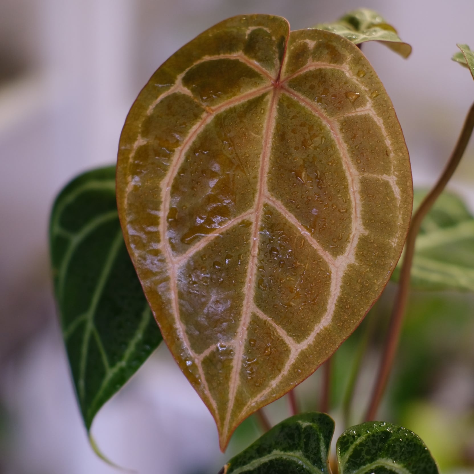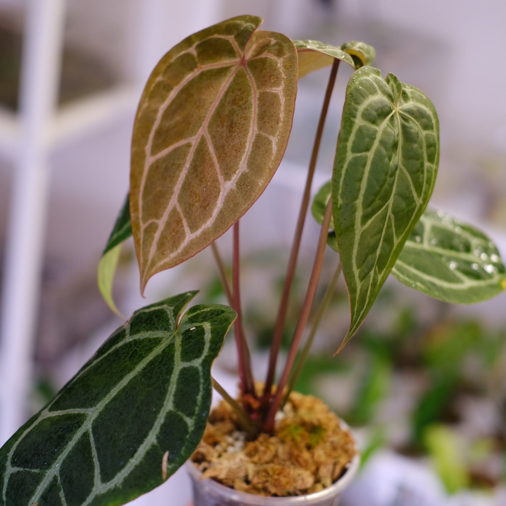 希少なアンスリウム同士のハイブリッドです。成長するとパピラミナムのビロード感とザラ ミシェルの光沢感が融合された美しい葉を展開します。