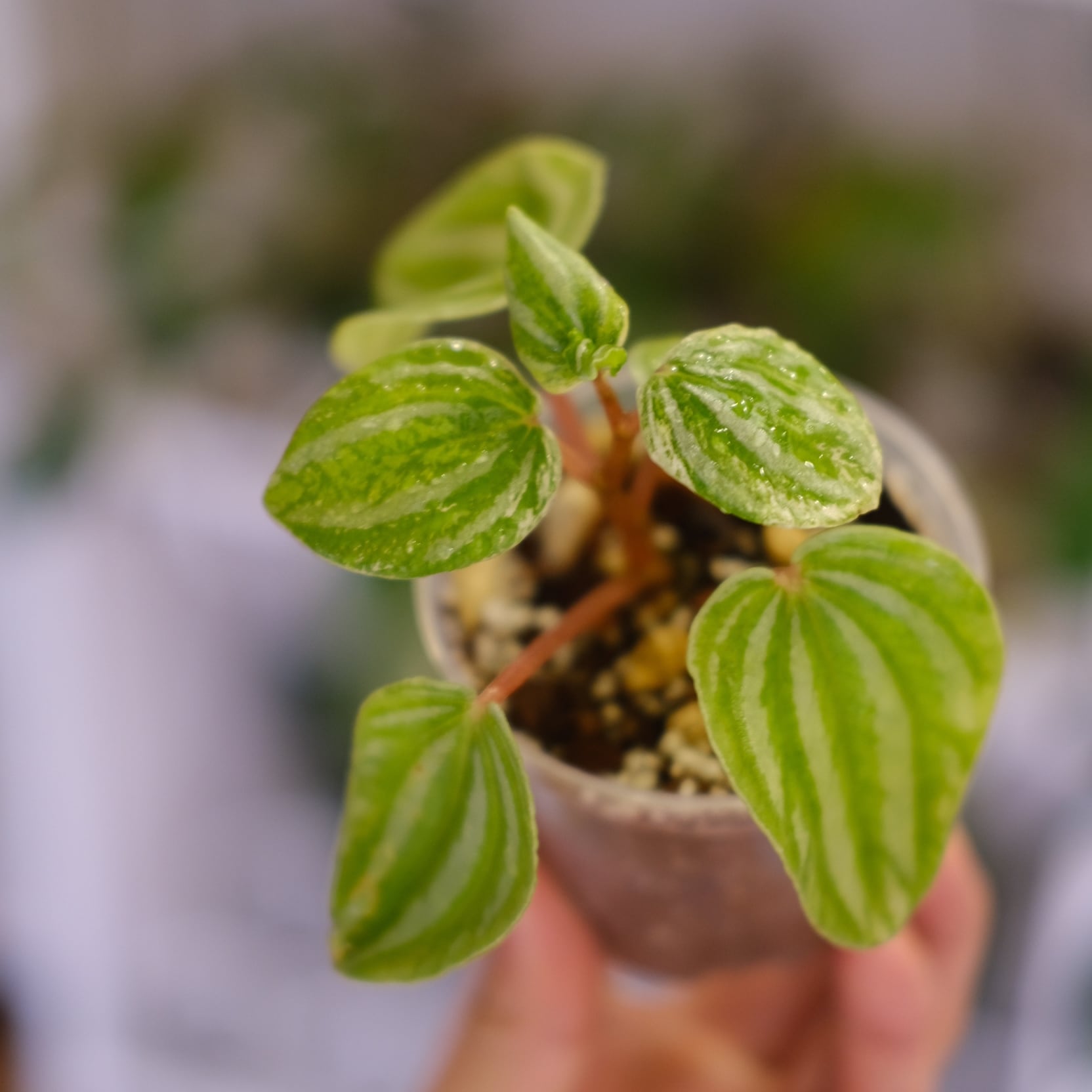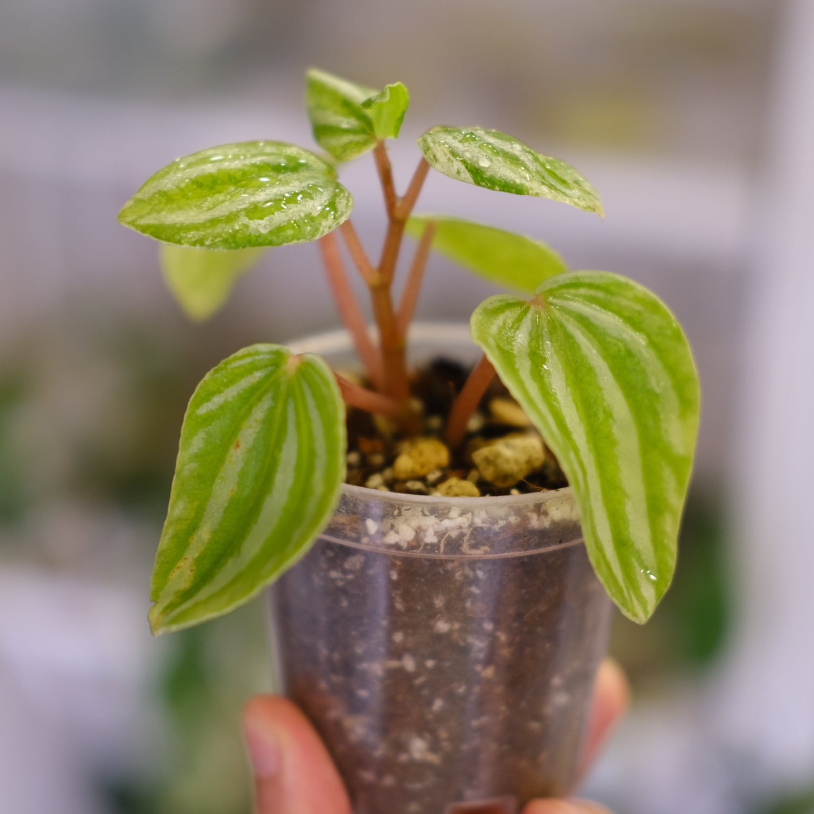 Peperomia argyreia 'Variegated' は、スイカペペロミア(Peperomia argyreia)の斑入り品種で、葉の模様が通常のスイカ模様に加えて、煌びやかに光るミント色の斑入りの非常に美しい観葉植物です。海外のコレクターから特別に仕入れた希少品種で、恐らく国内では初の展開になるかと思います。