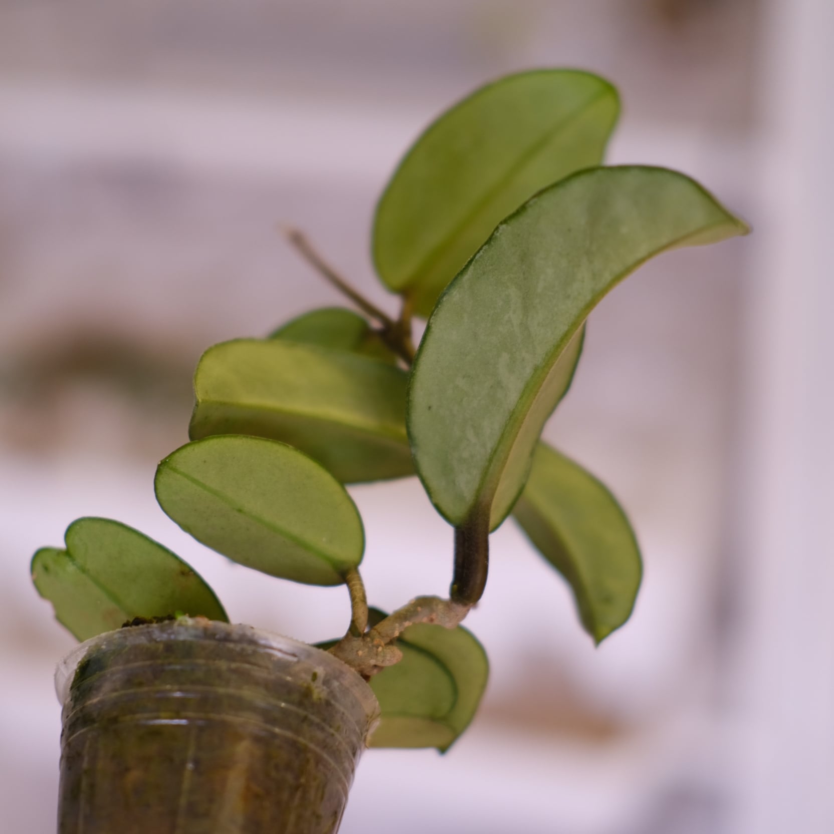 銀白色の葉と緑色の葉脈が特徴的な、美しいバリエガータ品種です。葉全体がシルバーや白に近い色合いを持ち、葉脈部分には淡い緑色の模様が見られます。新しい葉は特に鮮やかな白に近い色合いで、成長とともにより深みのあるトーンへと変化していきます。丈夫で耐陰性があるため、初心者から上級者まで楽しめる人気の高いホヤです。