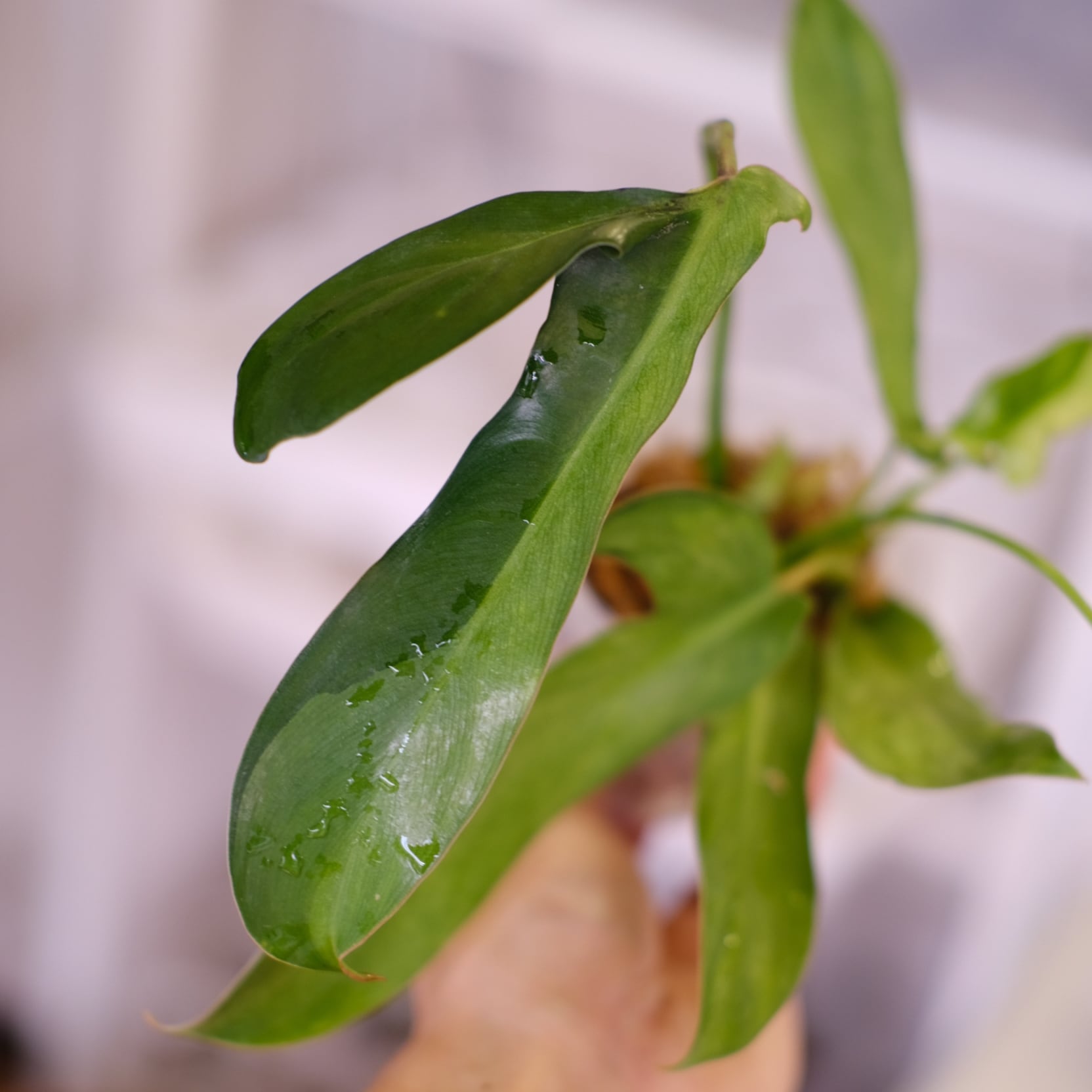 Philodendron longilobatumは、細長く剣のような葉と滑らかな艶が特徴の希少なフィロデンドロンです。葉の基部には小さな耳状の切れ込みがあり、成熟すると1枚が1メートル近くまで伸び、彫刻的な存在感を放ちます。