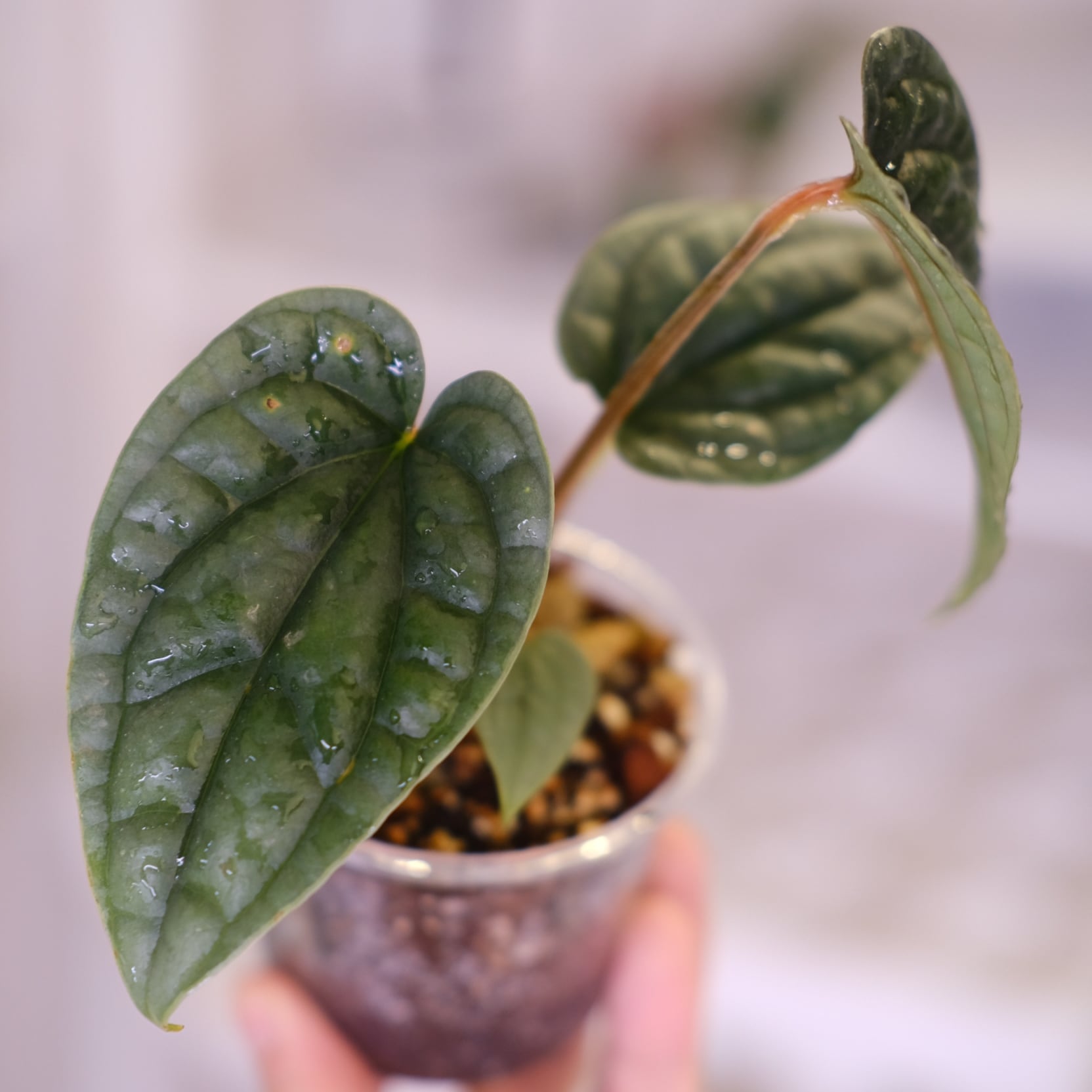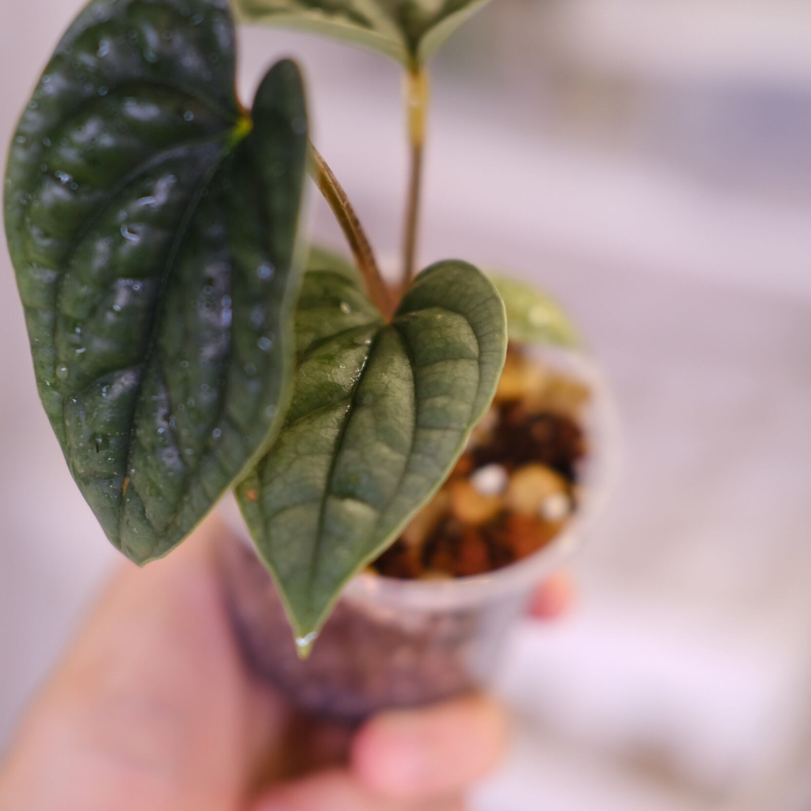 最大の魅力は名前の通り、銀色の光沢を帯びた葉。葉の表面に独特の質感があり、まるで革のような質感をもつルクスアリンスの中でも、とくに珍しい“シルバータイプ”です。