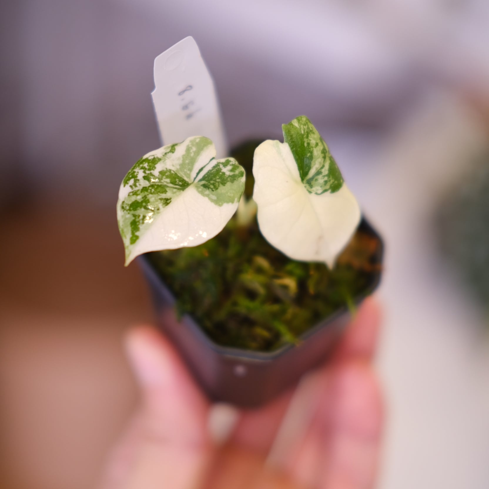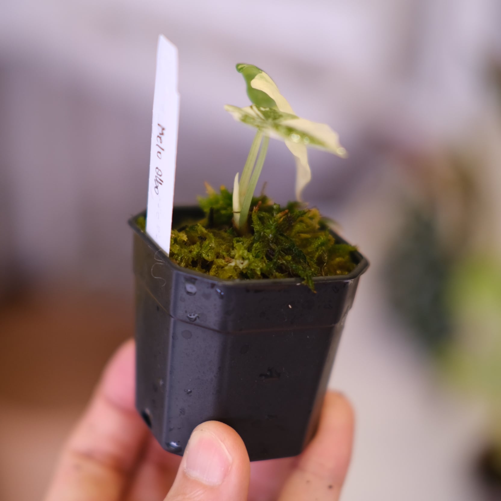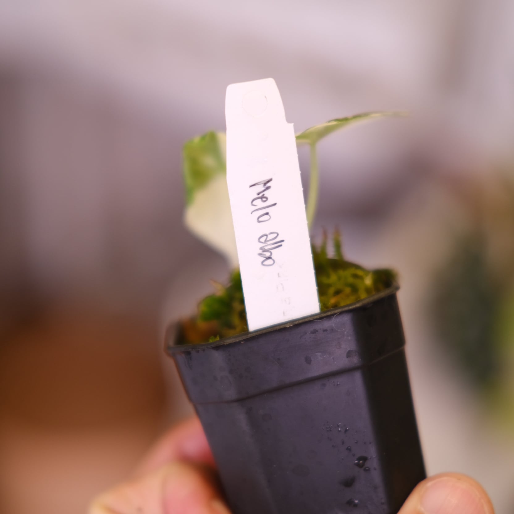アロカシア・メロ・アルボ(Alocasia melo 'Albo' Variegated)は、極めて希少な斑入り個体で、通常のメロには見られない白〜クリーム色のマーブル模様が特徴です。