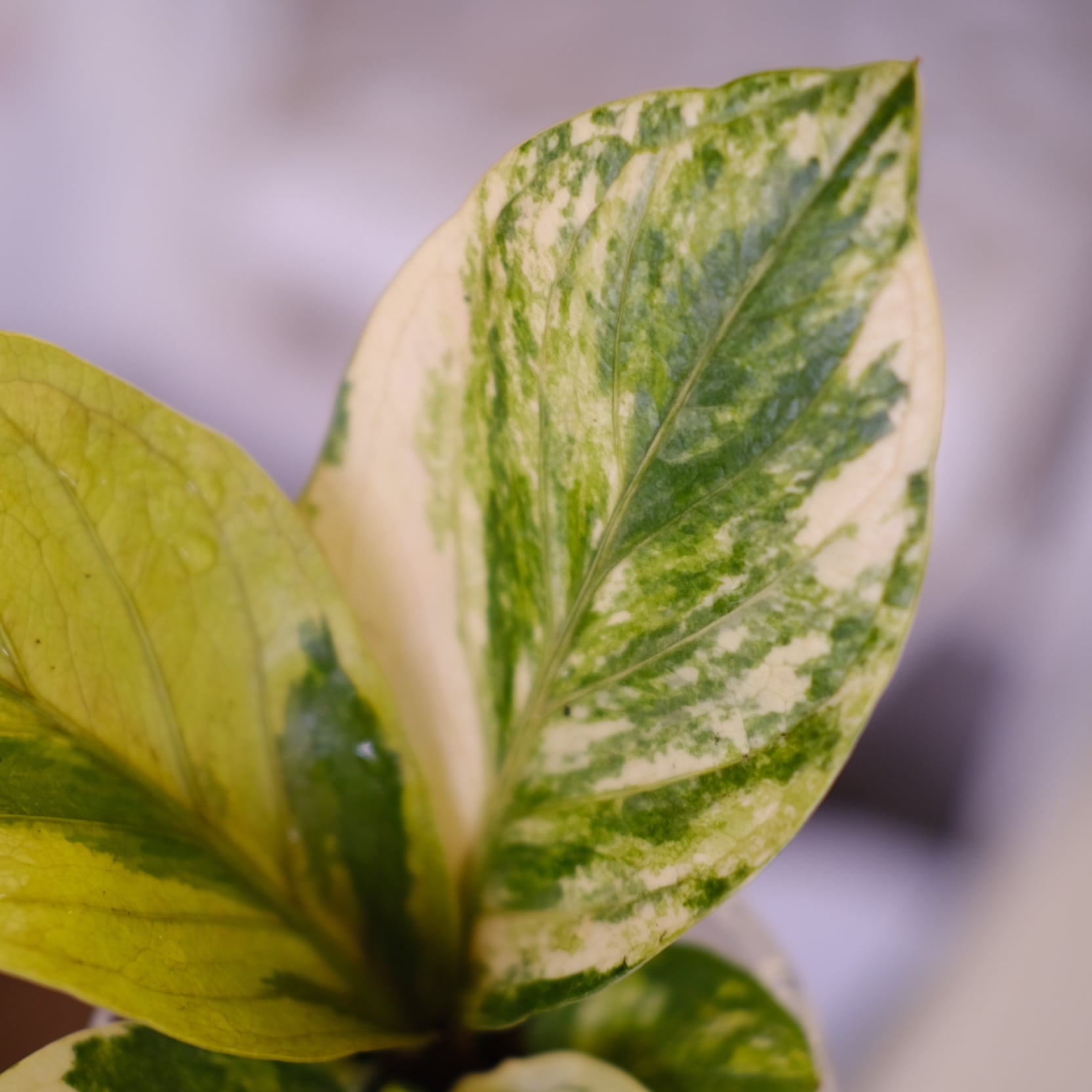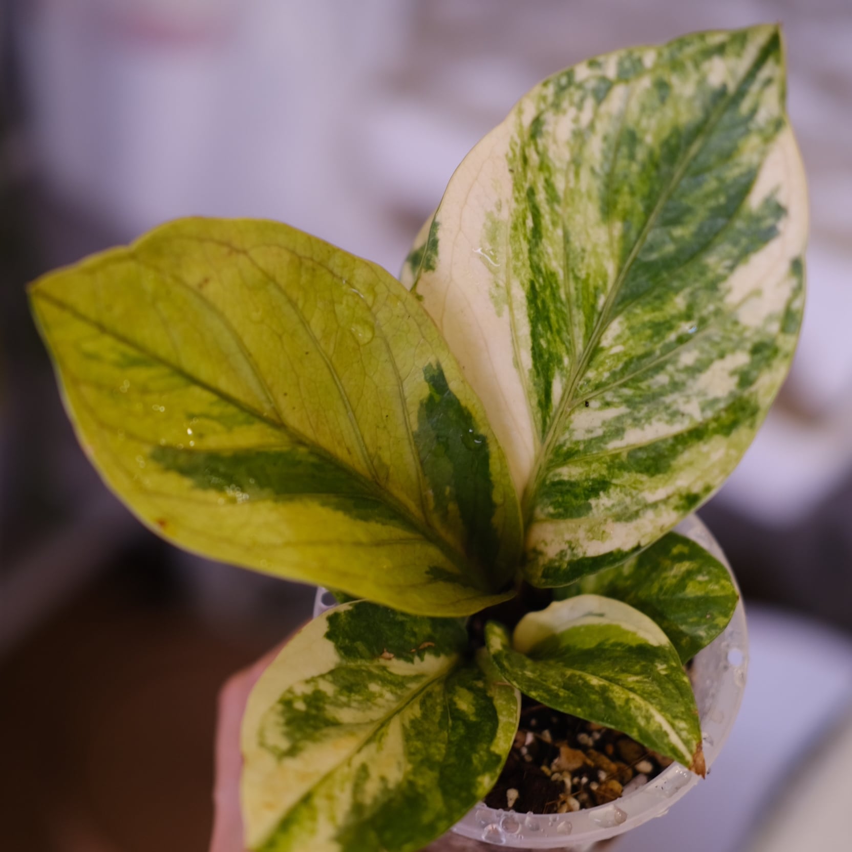 アンスリウム フーケリー 斑入り(Anthurium hookeri variegata)は、厚みのある革質葉にクリーム〜黄緑の斑が入る希少タイプです。葉縁が波打つ形状が特徴的で、成長に伴い葉が立ち上がり、鳥の巣状のフォルムを形成します。斑は個体ごとに異なり、光量や温度によって色味の濃淡が変化します。