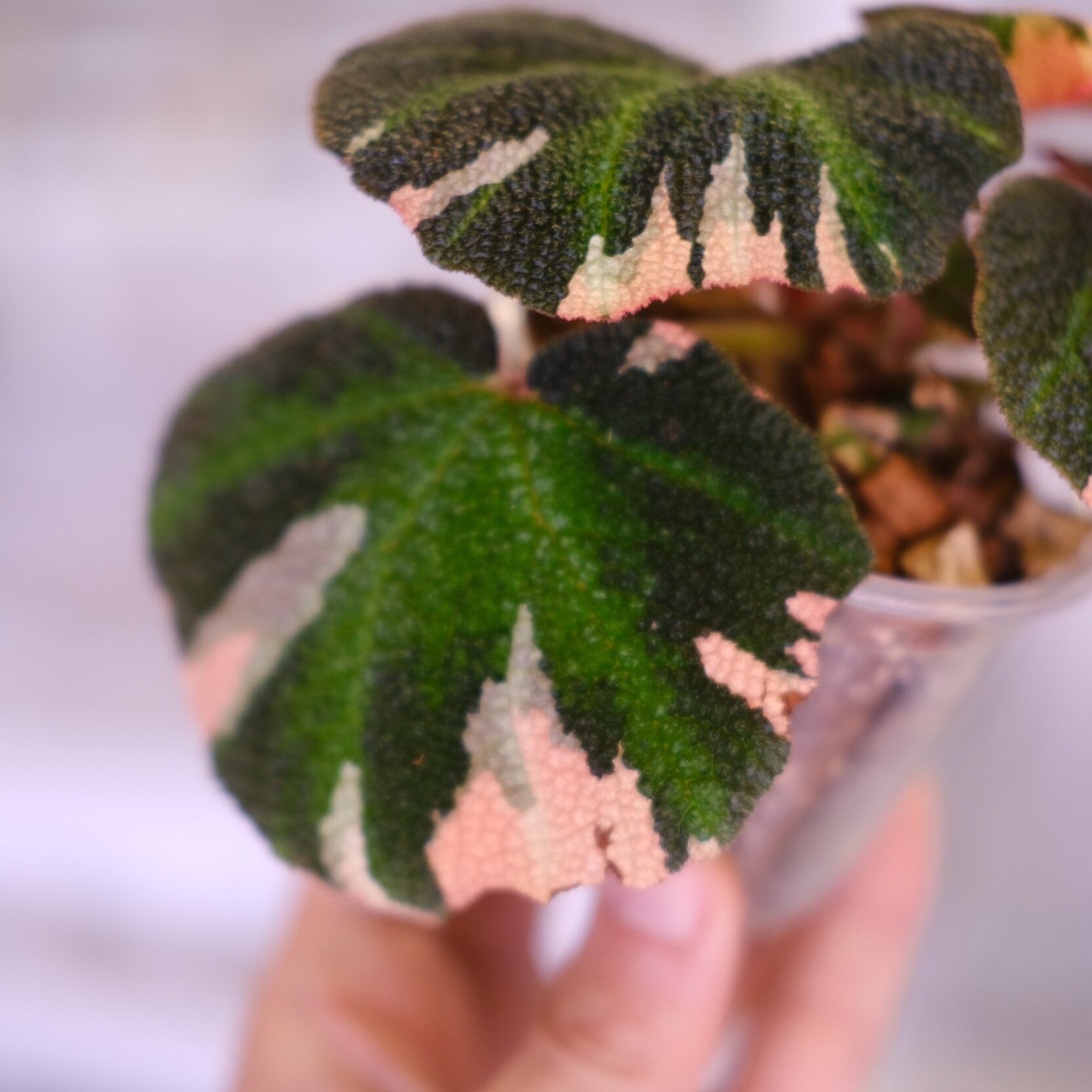 通常の Begonia soli-mutata と同様に、葉には特徴的なクロス模様がありますが、‘Variegated’(斑入り)タイプはさらに珍しく、緑色の葉に白やピンク色の斑が入る美しい品種です。比較的コンパクトに成長をしますが、環境が合えば葉が沢山展開します。