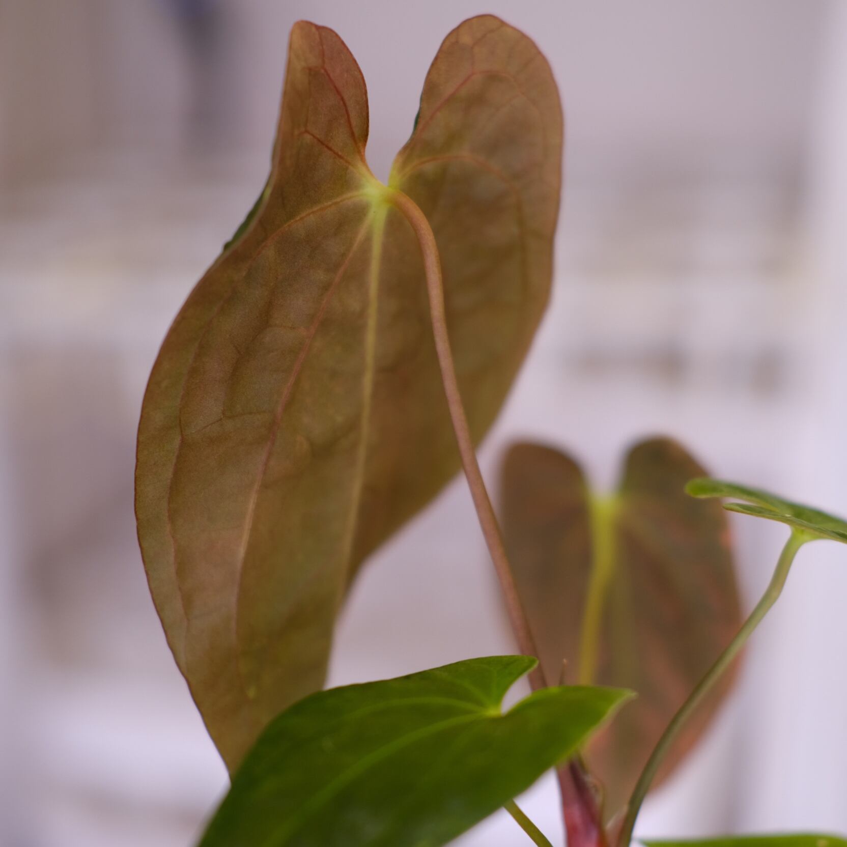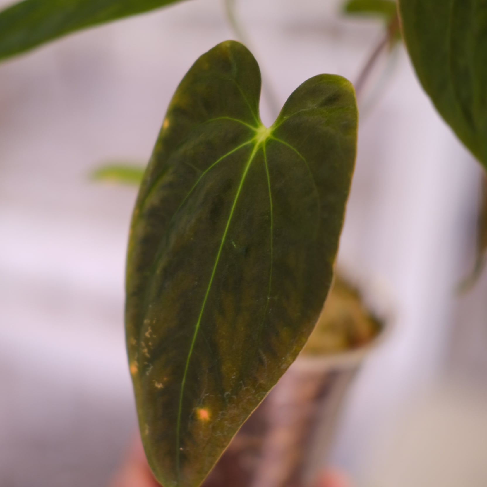 このアンスリウムは、Papillilaminum GunaYala(パピリラミナム・グナヤラ)と Forgetii Dark(フォルゲッティ・ダーク)を交配したハイブリッド品種です。それぞれの特徴を引き継ぎ、美しい葉姿と深みのある色合いが魅力のレア種です。