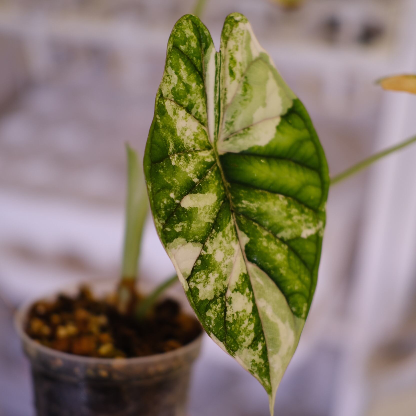 ドラゴンの鱗のような質感の葉が特徴的な、アロカシア ドラゴンスケールの斑入りです。アロカシアの中でも希少で人気の高い品種です。