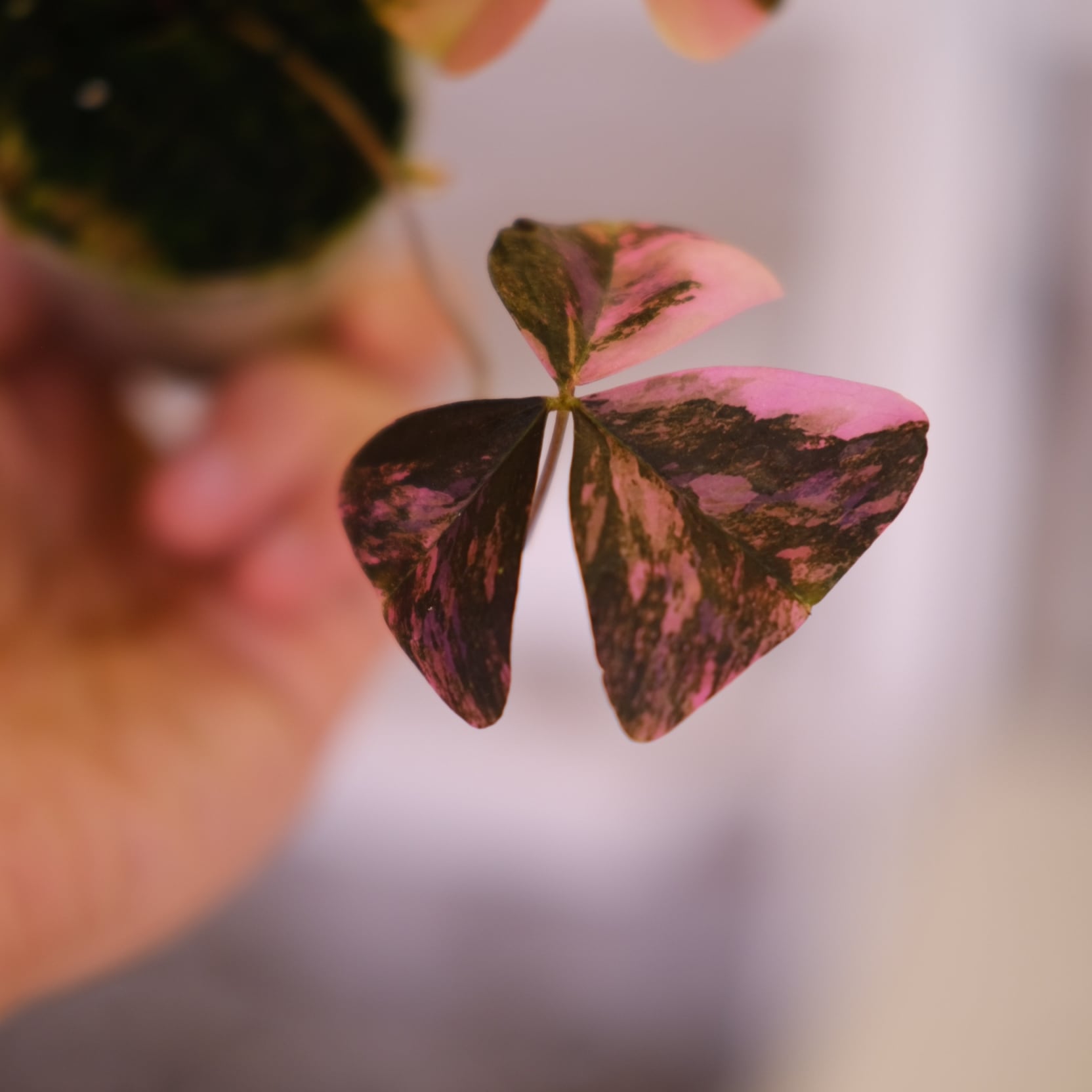オキザリス トライアングラリス 斑入り(Oxalis triangularis variegated)は、紫葉と明るい斑のコントラストが美しい希少な園芸タイプです。昼夜で葉を開閉する性質があり、照度や温度、湿度に対して敏感に反応します。斑入り個体はやや光を好む傾向があり、明るい室内での管理に適しています。