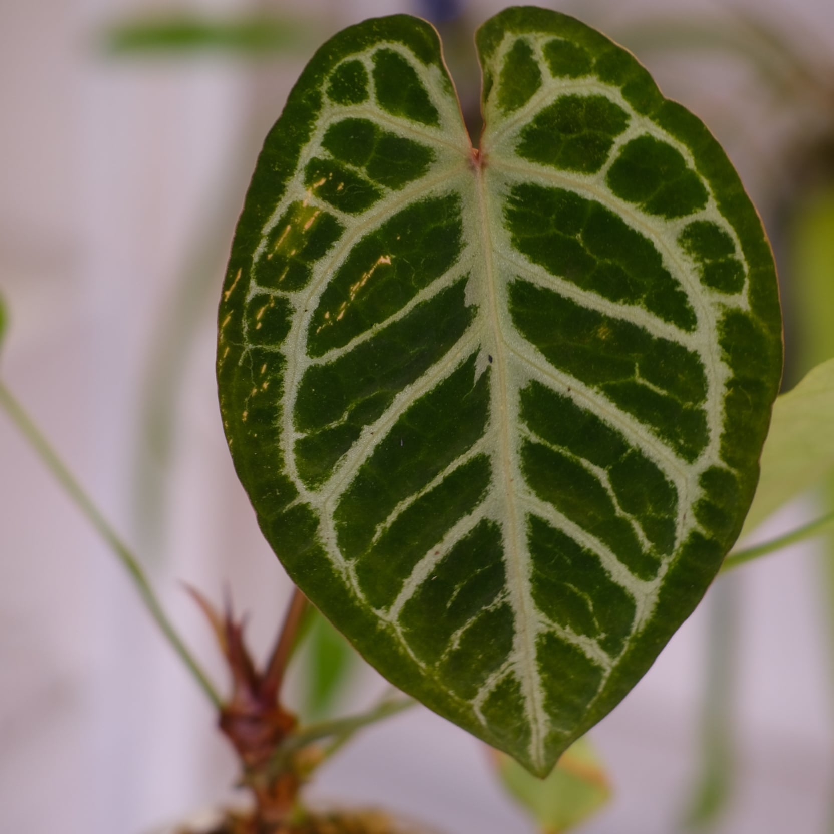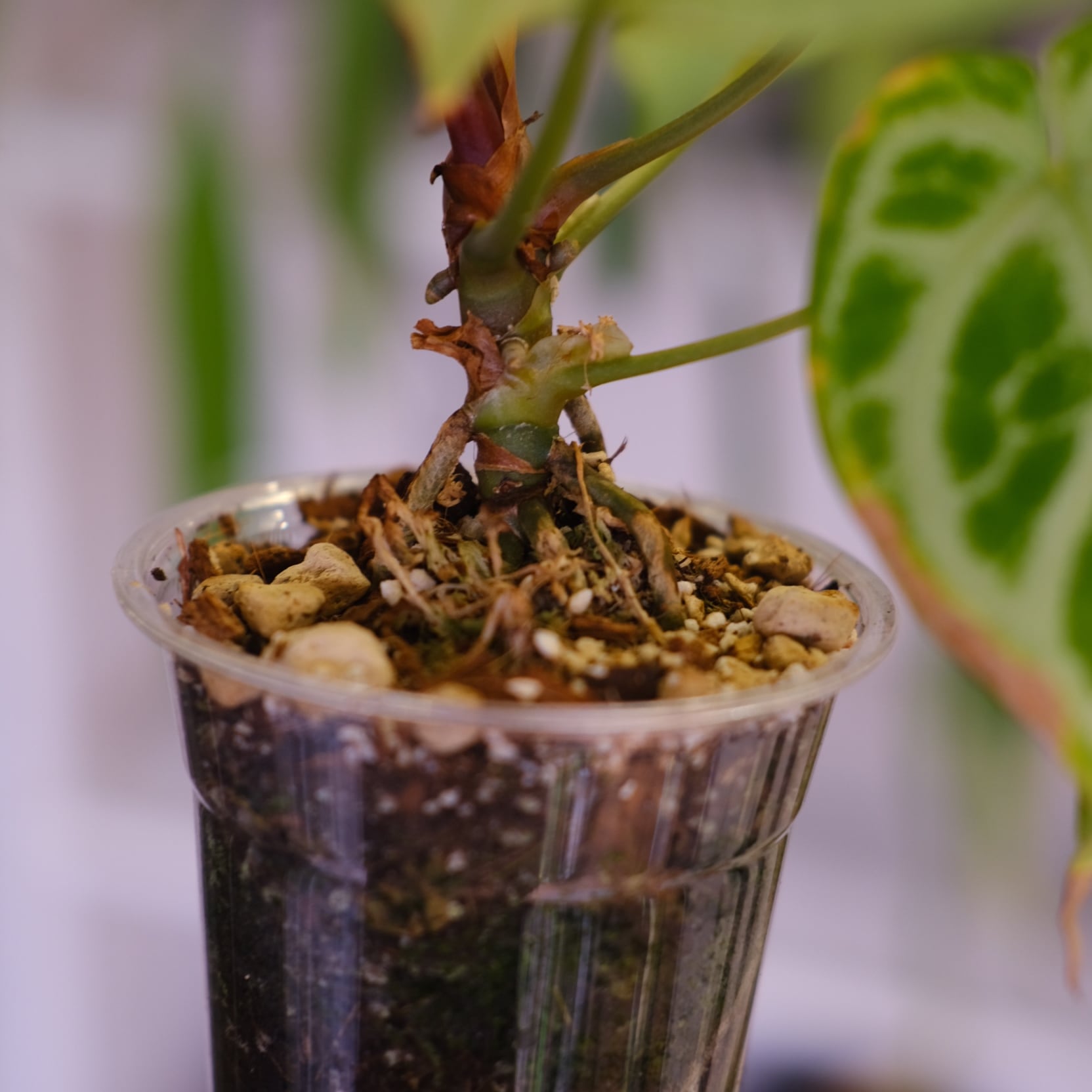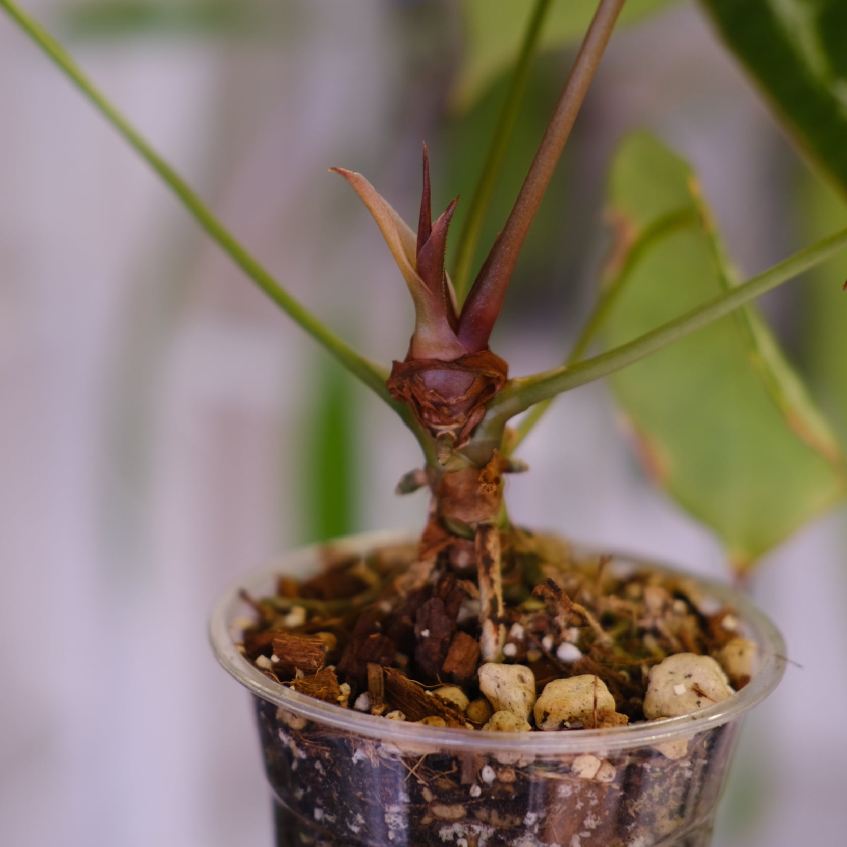 Anthurium Red Crystallinum × Anthurium Silver Blush の希少なハイブリッドです。銀白色の葉脈が深みのある赤色の葉に走る美しい個体です。 レッドクリスタリナムの新葉の展開時に赤みが強く出る特徴を引き継いでいます。
