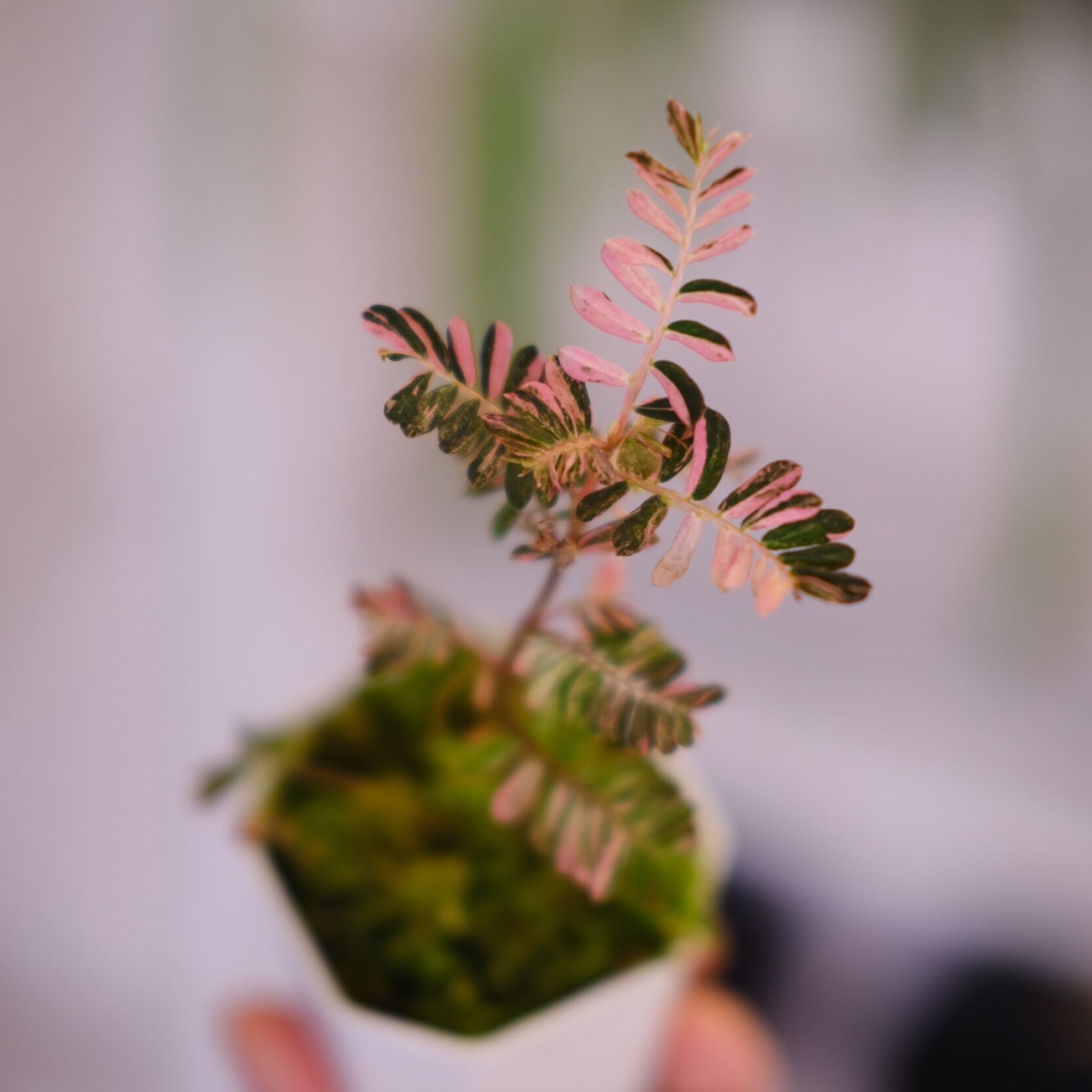 Phyllanthus urinaria 'Pink Variegated'(フィランサス・ウリナリア ピンク斑入り)は、繊細な見た目の美しさとは裏腹に、比較的育てやすい希少植物です。成長しても50cmほどに収まるサイズ感も特徴です。十分な光量・高湿度・20~25度程度の温度環境を保つとピンク色の発色が目立つ新芽が展開します。