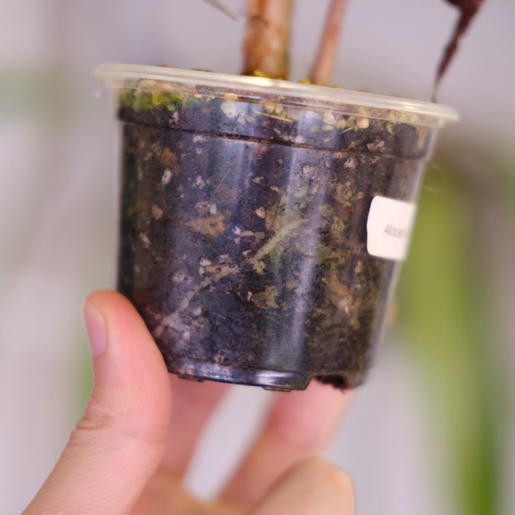 詳しい交配情報は公開されていませんが、Alocasia sanderiana や Alocasia lauterbachiana、または Alocasia ‘Polly’ などの鋭角系アロカシアをベースにした交配と考えられています。