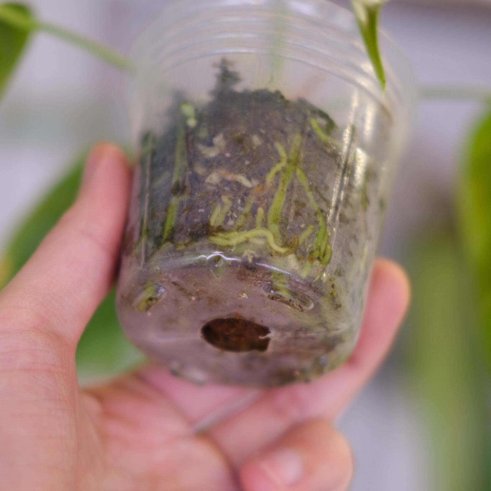 鉢は成長した植物の根を観察できるプラスチック鉢となり、アンスリウムの生育に適した【水苔】を用土としています。
