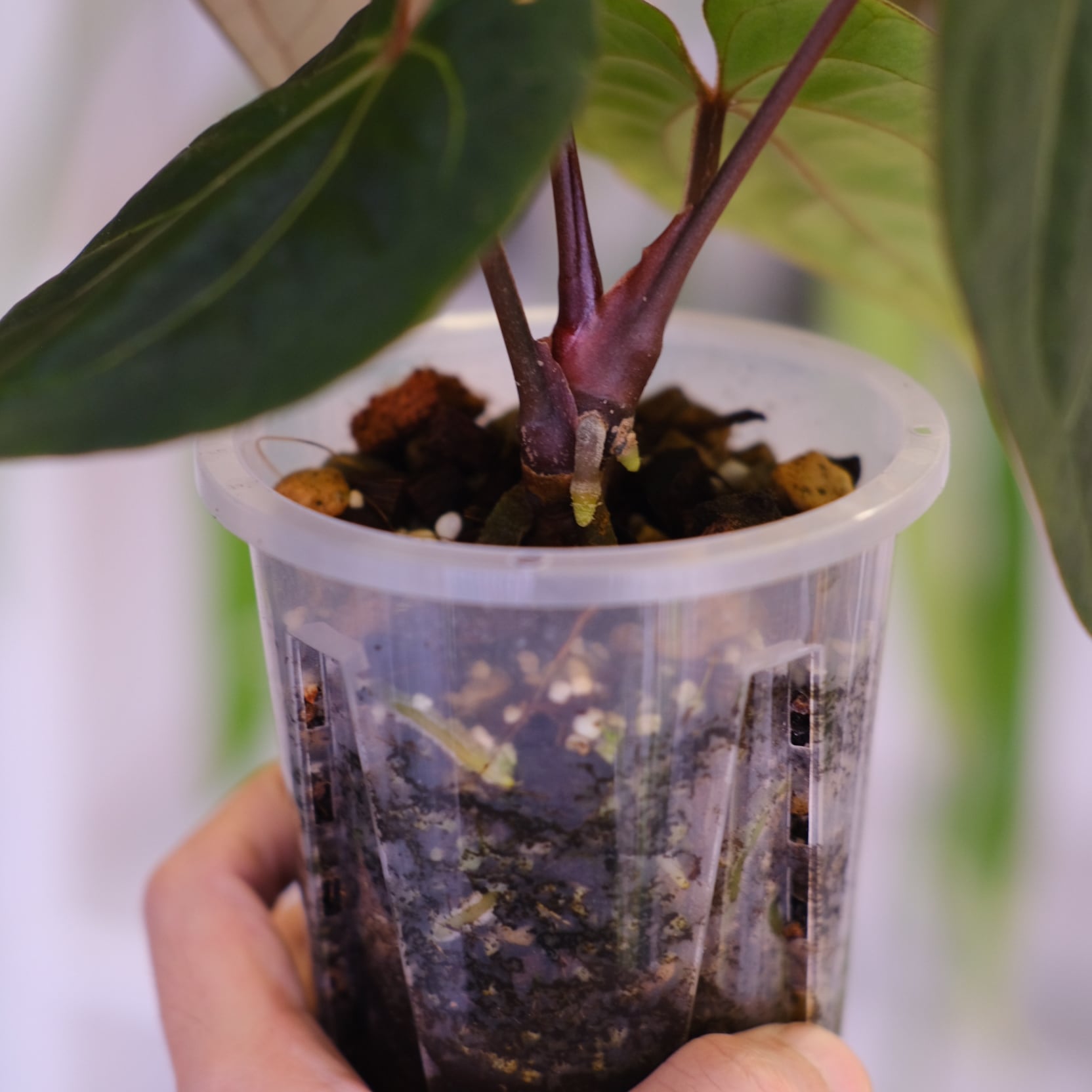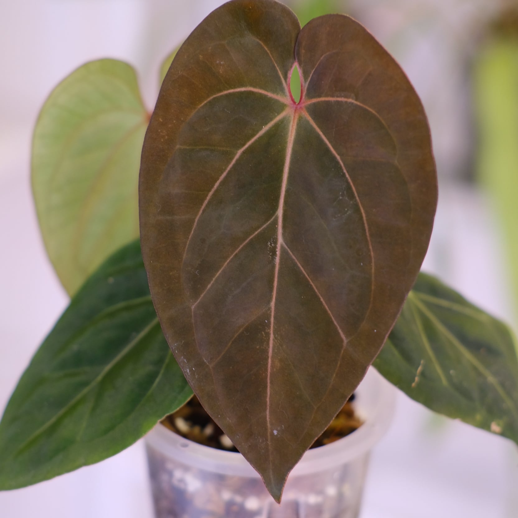 アンスリウムの希少種「KOS × Michelle」のハイブリッド種です。Anthurium King of Spadesの深みのある色が強調されつつ、Anthurium Michelleの赤みのあるは脈が入った美しい新芽を展開しています。