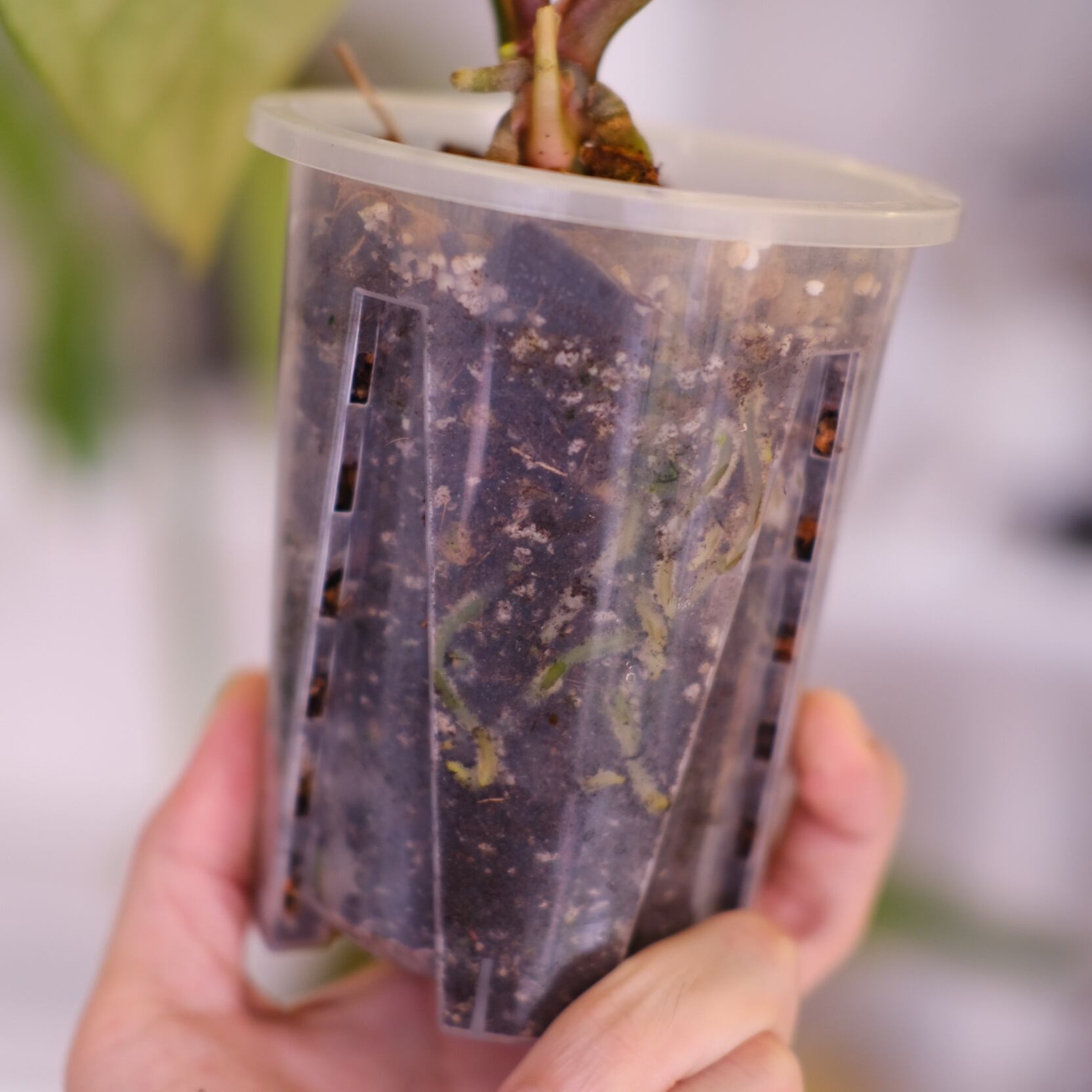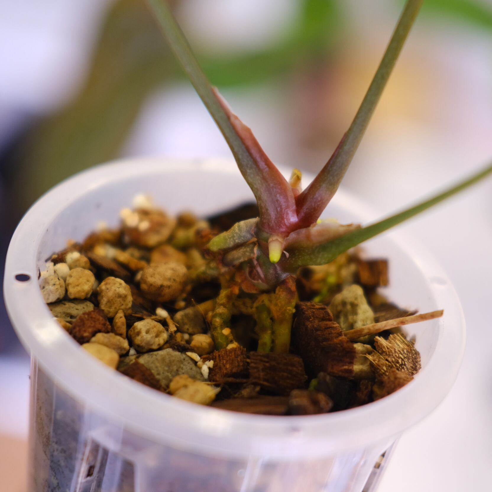 tokyoplantsオリジナルブレンドのI'm original SOILを使用。ココチップ、日向石、発酵樹皮、ミミズ堆肥など6種の天然素材をバランスよく配合し、通気性と保水性を両立。着生根の酸素供給を妨げず、健康な根張りを促します。