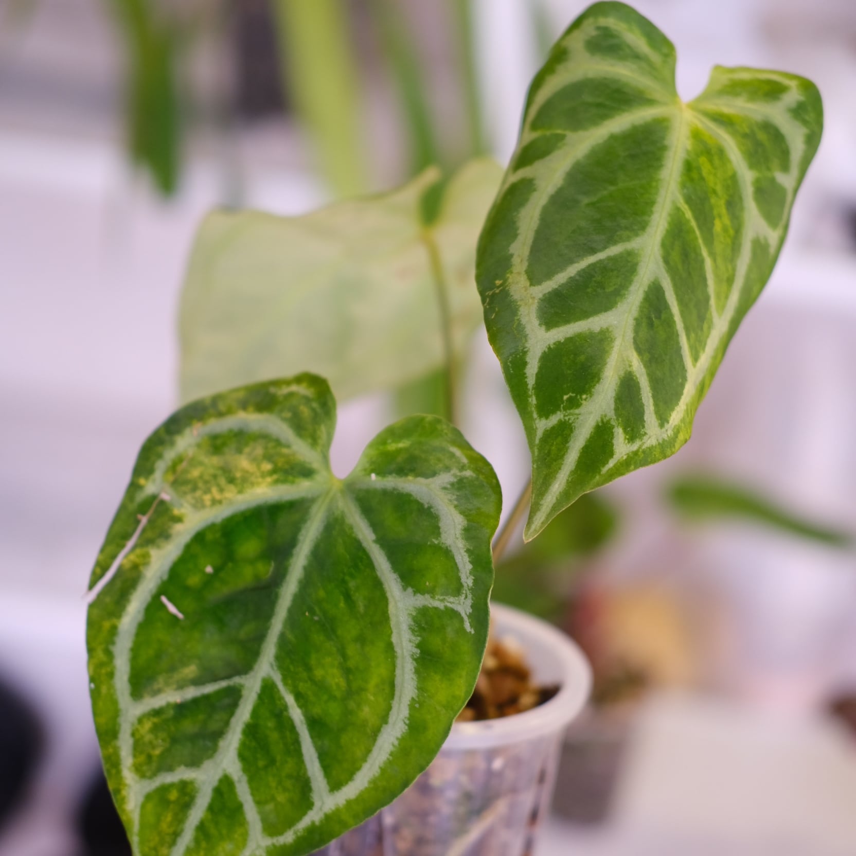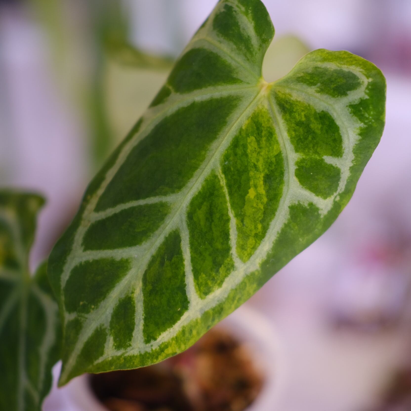 Anthurium crystallinum varigated は、深いベルベットグリーンの葉面に黄緑の葉脈が入る選抜個体です。通常のクリスタリナムよりも葉脈色が明るく、照度・湿度によって発色が変化します。光量が高い環境では黄色味が強まり、柔らかい光下では淡いライムグリーンの脈を見せる傾向があります。