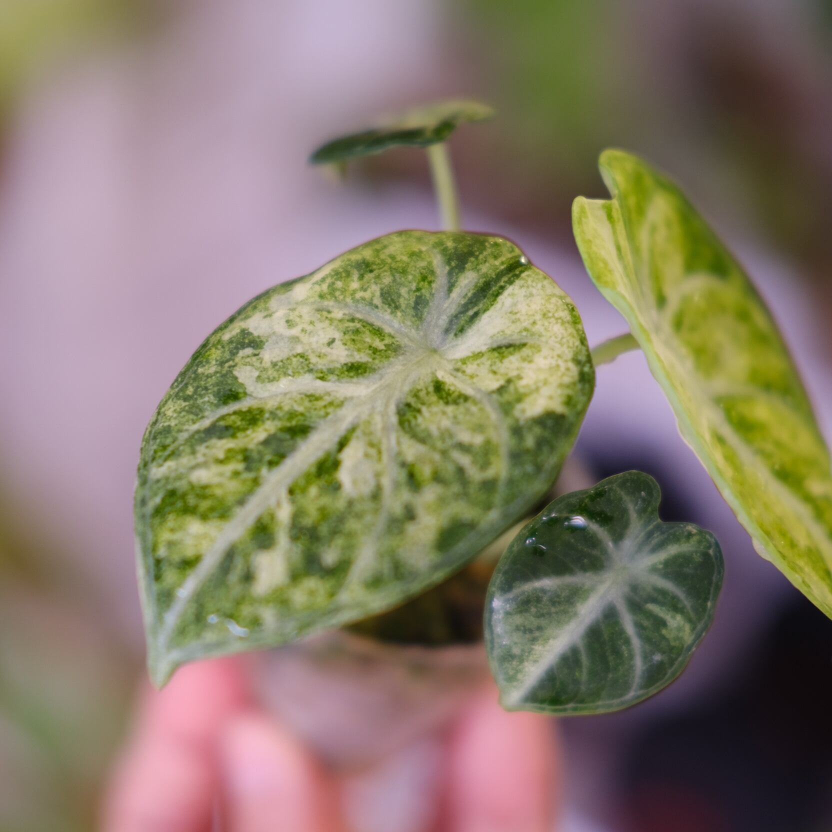 名前の通り、「トリカラー(三色)」の斑が入った葉が最大の特徴で、深い緑の葉に、白〜ピンクの不規則なスプラッシュ模様が入ります。斑の入り方がすべて異なるため、「一点もの」として扱われる希少なアロカシアです。