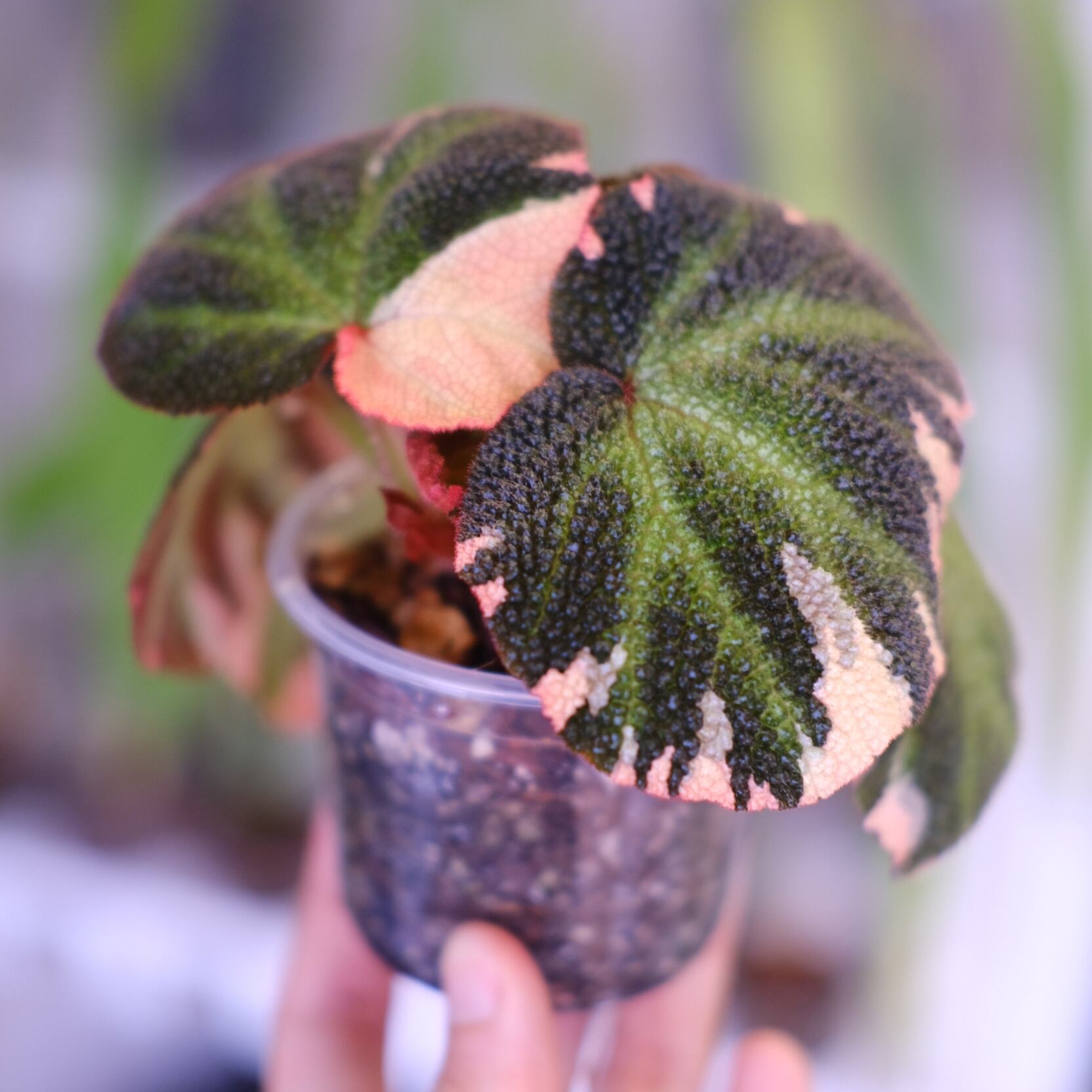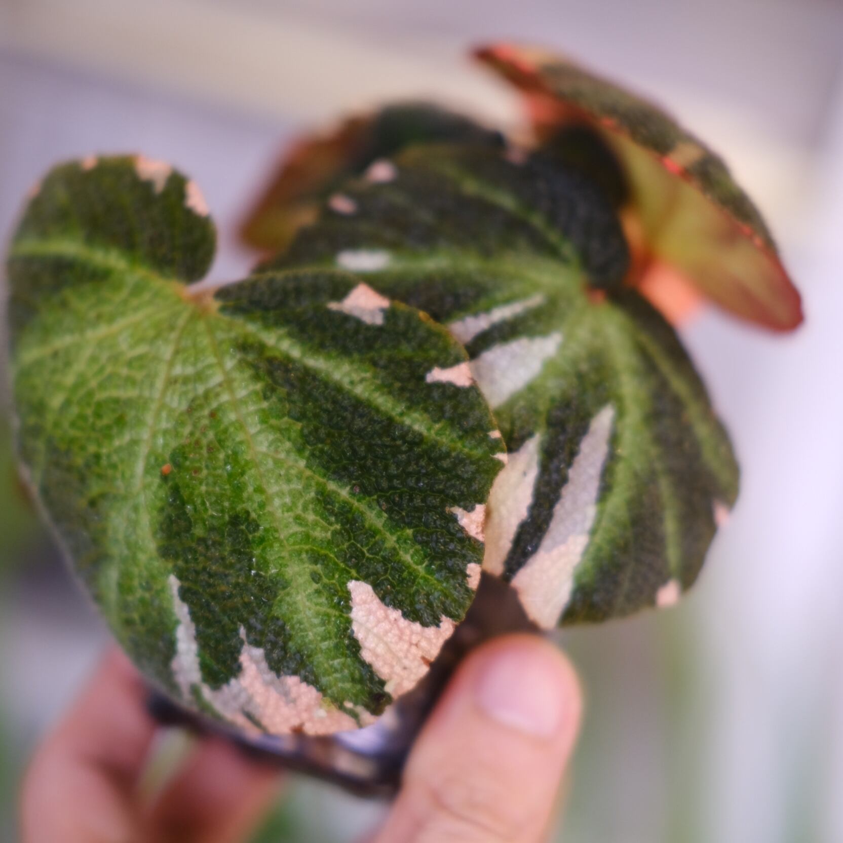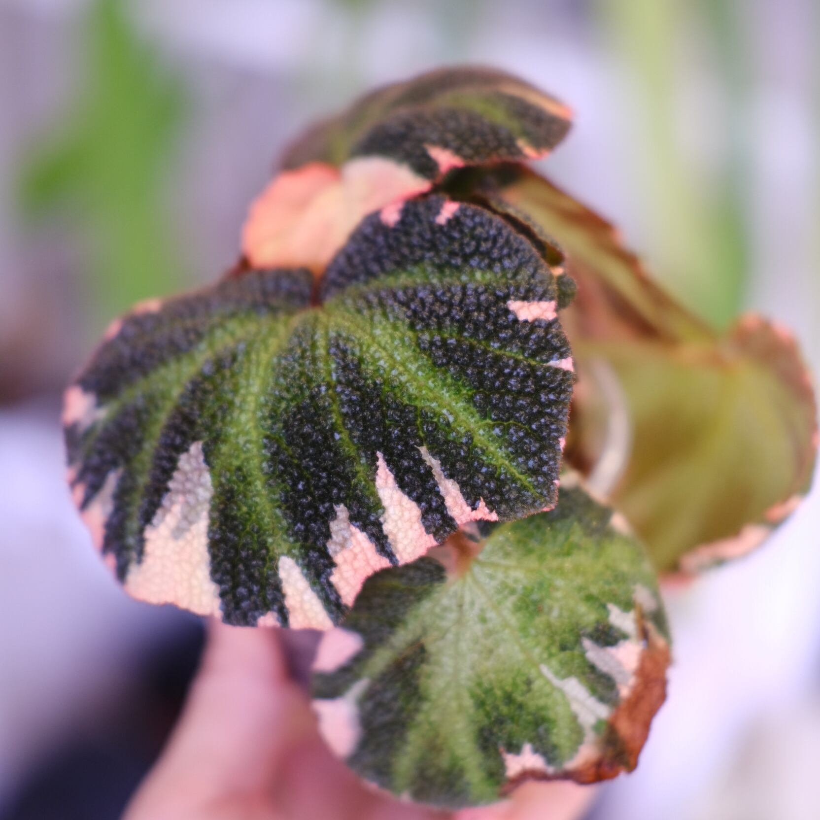 通常の Begonia soli-mutata と同様に、葉には特徴的なクロス模様がありますが、‘Variegated’(斑入り)タイプはさらに珍しく、緑色の葉に白やピンク色の斑が入る美しい品種です。比較的コンパクトに成長をしますが、環境が合えば葉が沢山展開します。