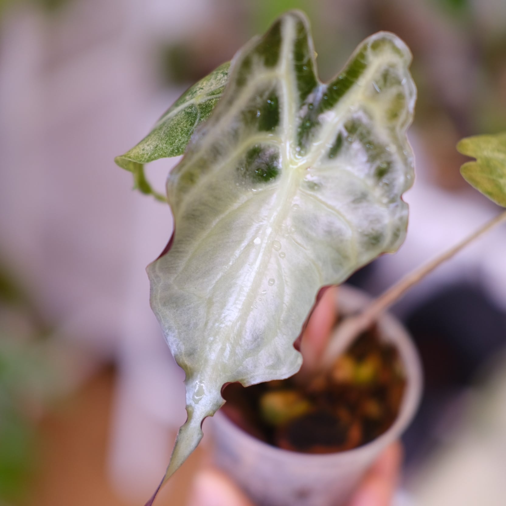 詳しい交配情報は公開されていませんが、Alocasia sanderiana や Alocasia lauterbachiana、または Alocasia ‘Polly’ などの鋭角系アロカシアをベースにした交配と考えられています。