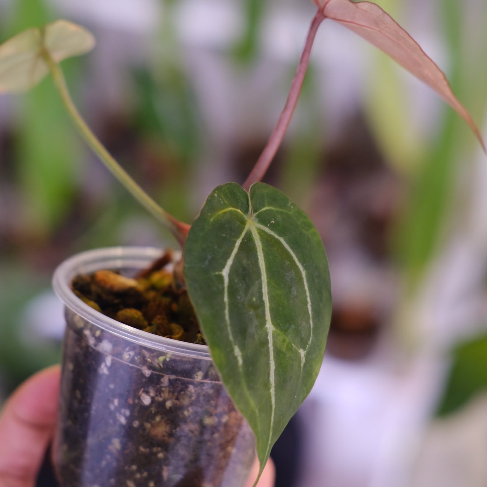 Anthurium cocolate × Anthurium Red crystallinum NSE は、ダークベルベット質と赤脈が組み合わさった交配個体で、両親の特徴がバランス良く現れます。