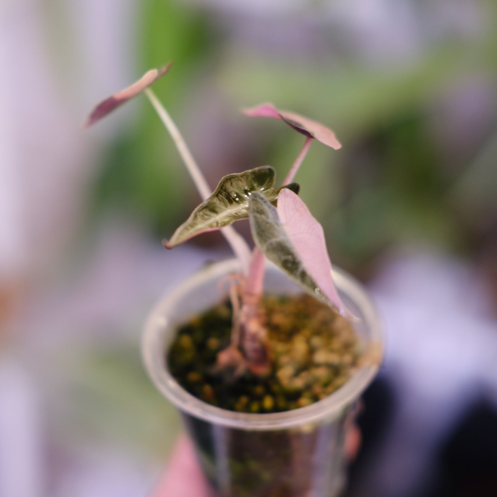 様々なレア品種が存在するアロカシアの中でも特に希少な斑入りの"アロカシア バンビーノ ピンク" 。 組織培養株のためピンク色の斑が出やすい個体です。