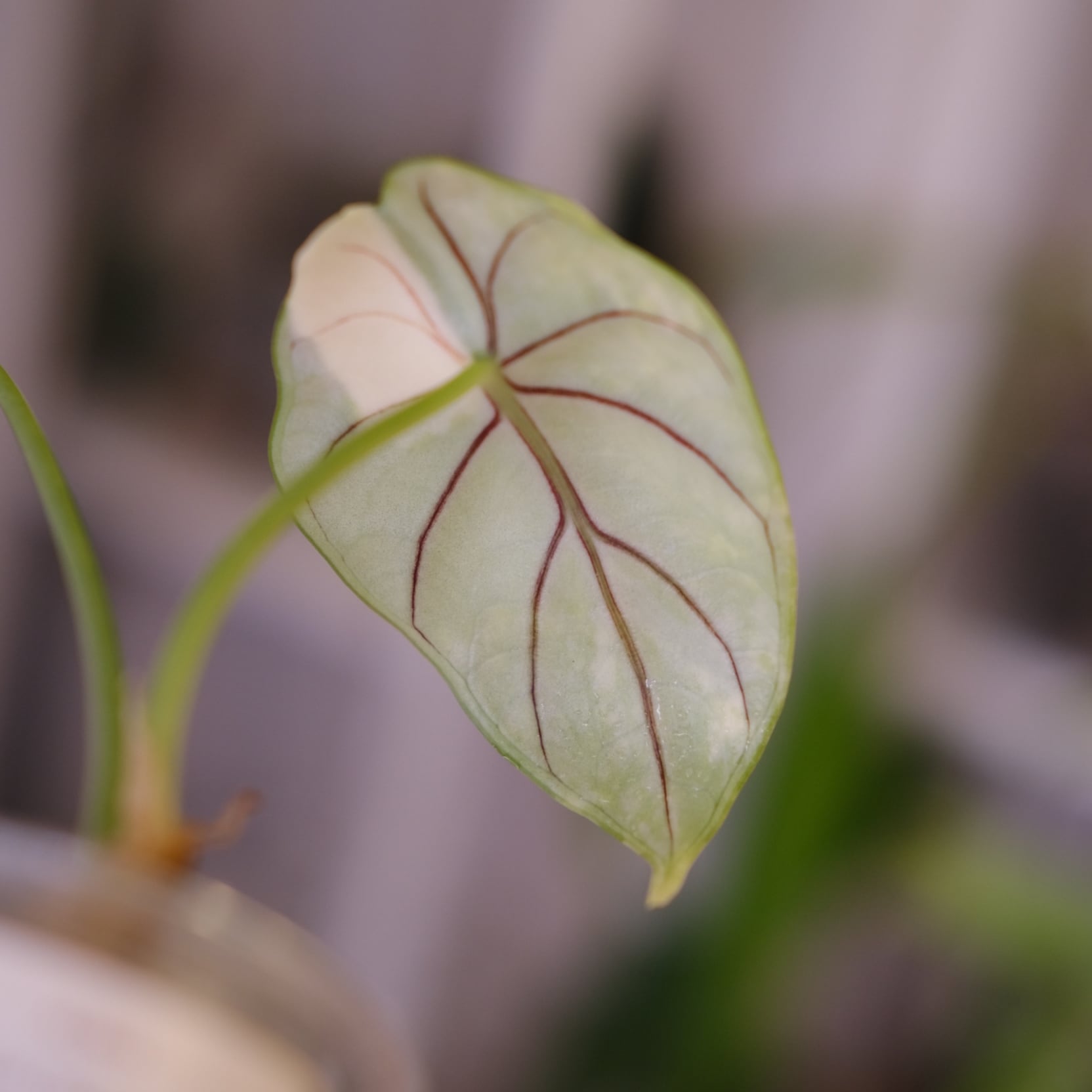 ドラゴンの鱗のような質感の葉が特徴的な、アロカシア ドラゴンスケールの斑入りです。アロカシアの中でも希少で人気の高い品種です。
