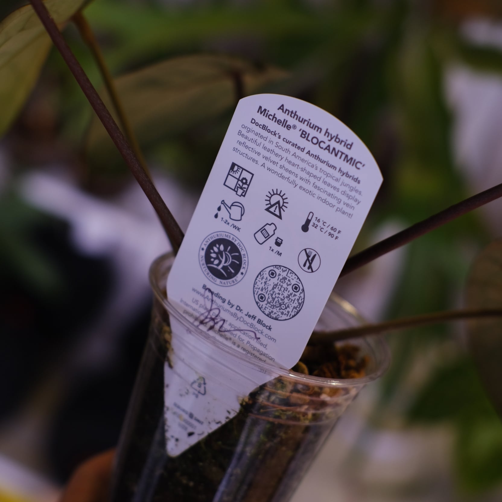 アンスリウム交配種、最高傑作の一つ'Michelle'です。2022 TPIE Show (Tropical Plant International Expo) 米国フロリダ州タンパ で「Best New Flowering Plant」を受賞した品種です。DOC BLOCK氏による交配種であることを証明する正規タグ付きです。