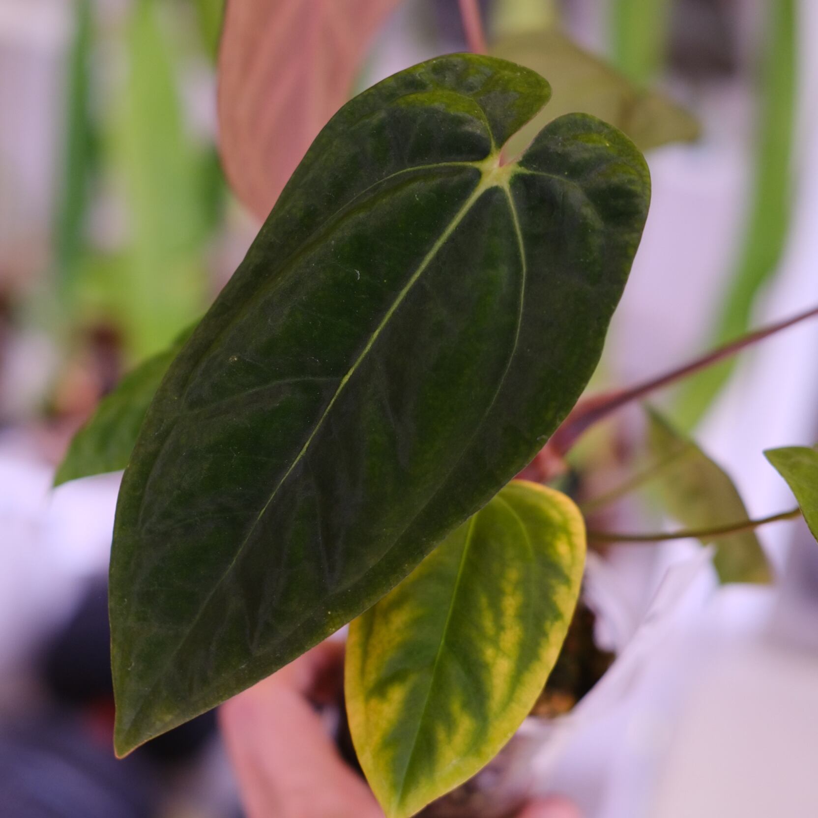 このアンスリウムは、Papillilaminum GunaYala(パピリラミナム・グナヤラ)と Forgetii Dark(フォルゲッティ・ダーク)を交配したハイブリッド品種です。それぞれの特徴を引き継ぎ、美しい葉姿と深みのある色合いが魅力のレア種です。