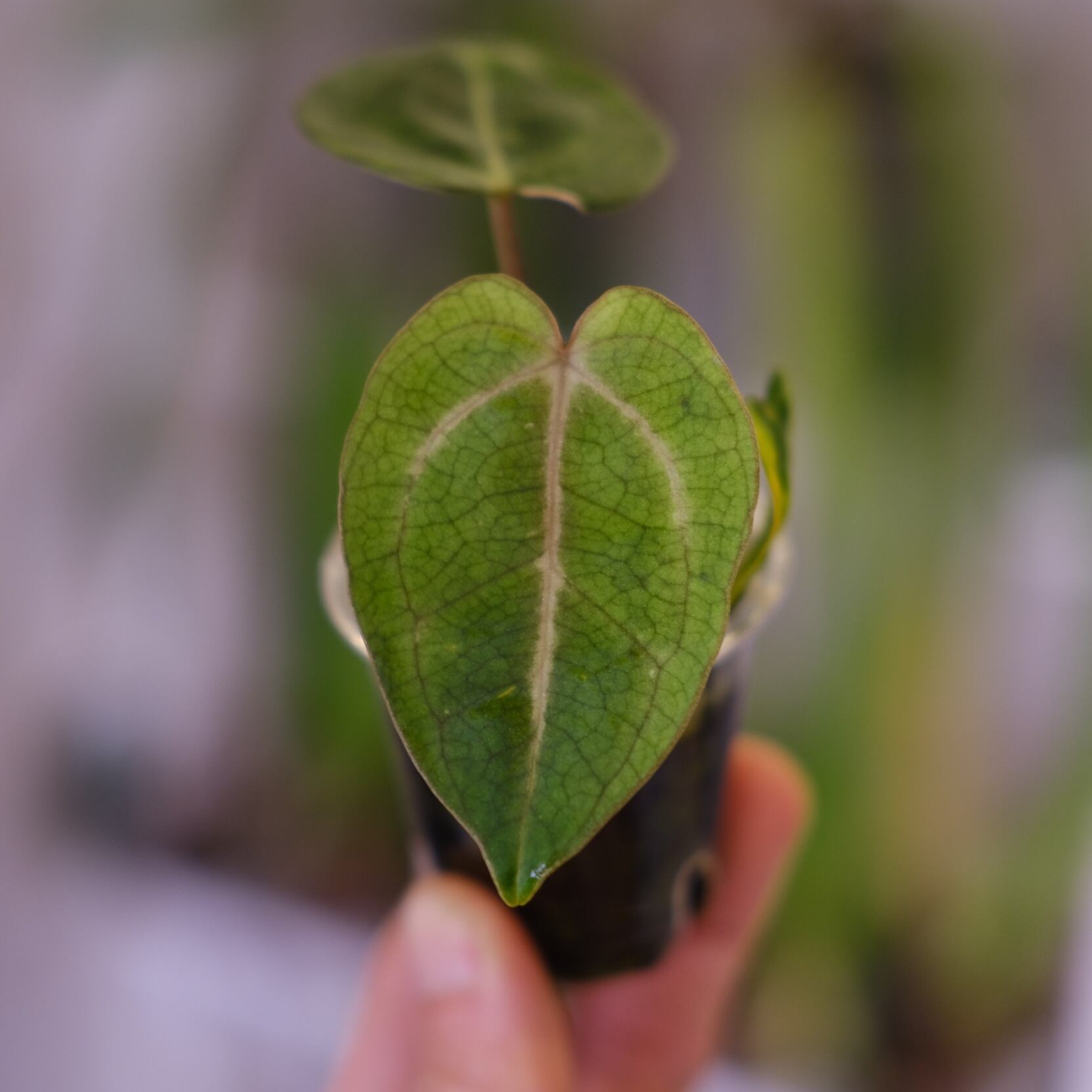 深みのある光沢を持ったハート型の葉にシャープな葉脈が入った姿が美しい、アンスリウム カーラブラッキアエの実生株です。いま世界中で最も注目を集めているアンスリウムの原種といっても過言ではない希少な種です。