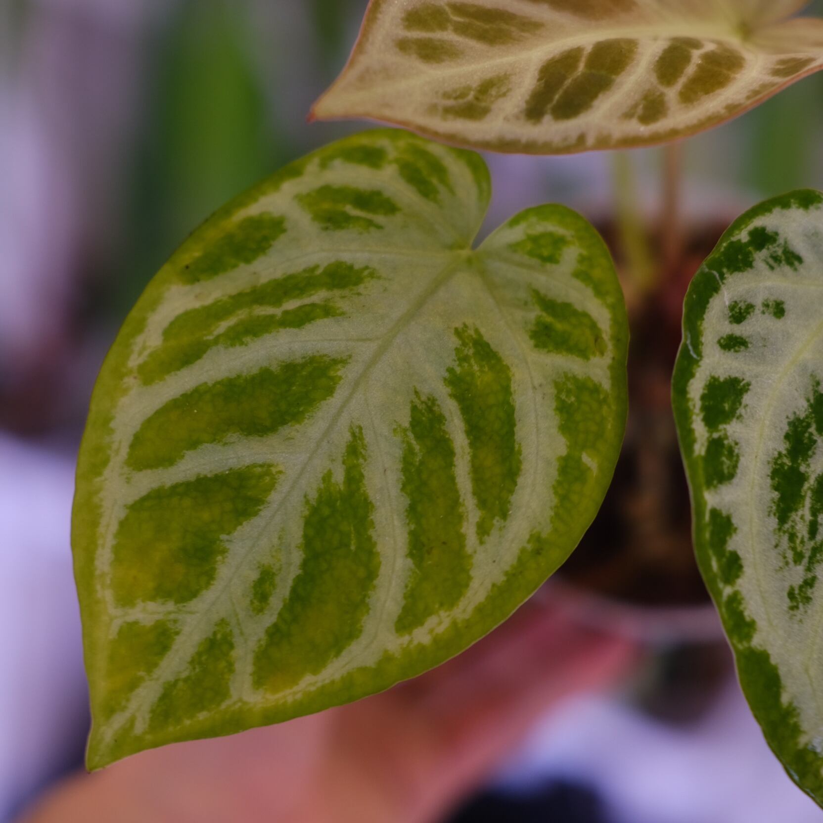 Anthurium Dorayaki × Anthurium Silver brush の希少なハイブリッドです。ドラヤキのぷっくりした可愛い葉の形を引き継ぎながら、シルバーブラッシュの銀色に輝くラメが入った葉脈が大変美しい品種です。