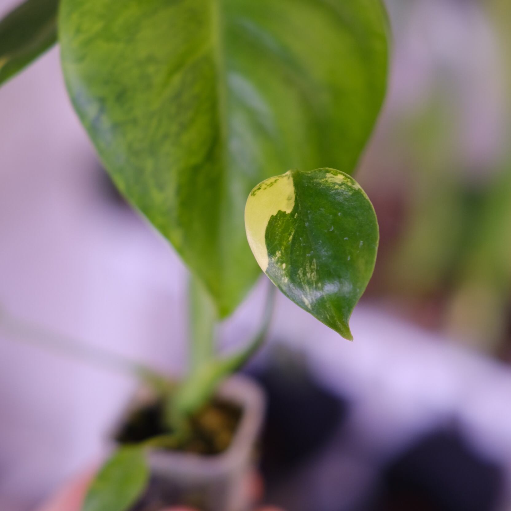 モンステラ イエロー マリリン(Monstera ‘Yellow Marilyn’) は、黄色系の斑が入る選抜系統で、白斑タイプに比べて葉緑素を保持しやすく、生育が安定しやすい特徴を持ちます。斑はライムグリーンからイエローへと変化し、葉の展開後に色味がはっきりしてくる傾向があります。