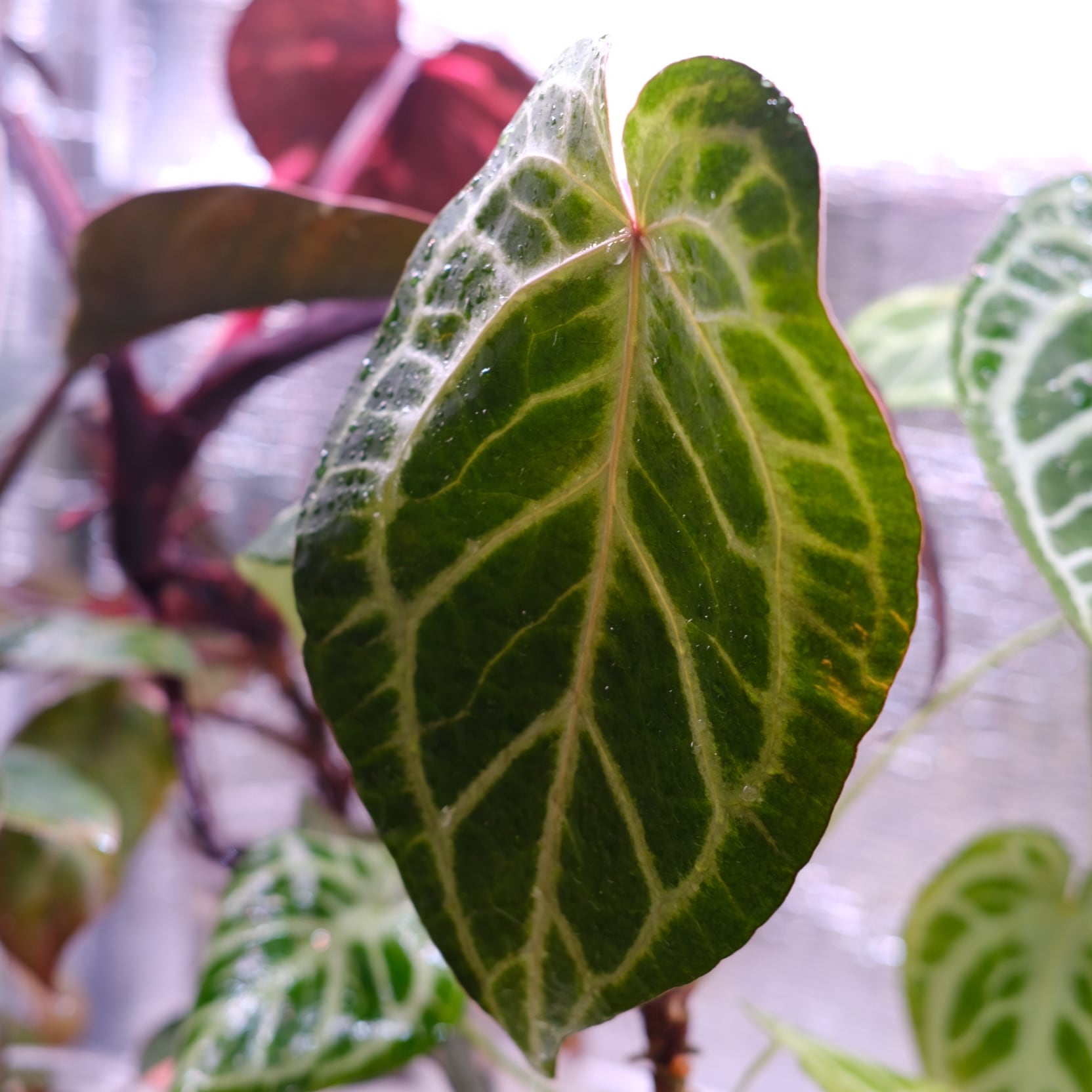 Anthurium Red Crystallinum × Anthurium Silver Blush の希少なハイブリッドです。銀白色の葉脈が深みのある赤色の葉に走る美しい個体です。 レッドクリスタリナムの新葉の展開時に赤みが強く出る特徴を引き継いでいます。