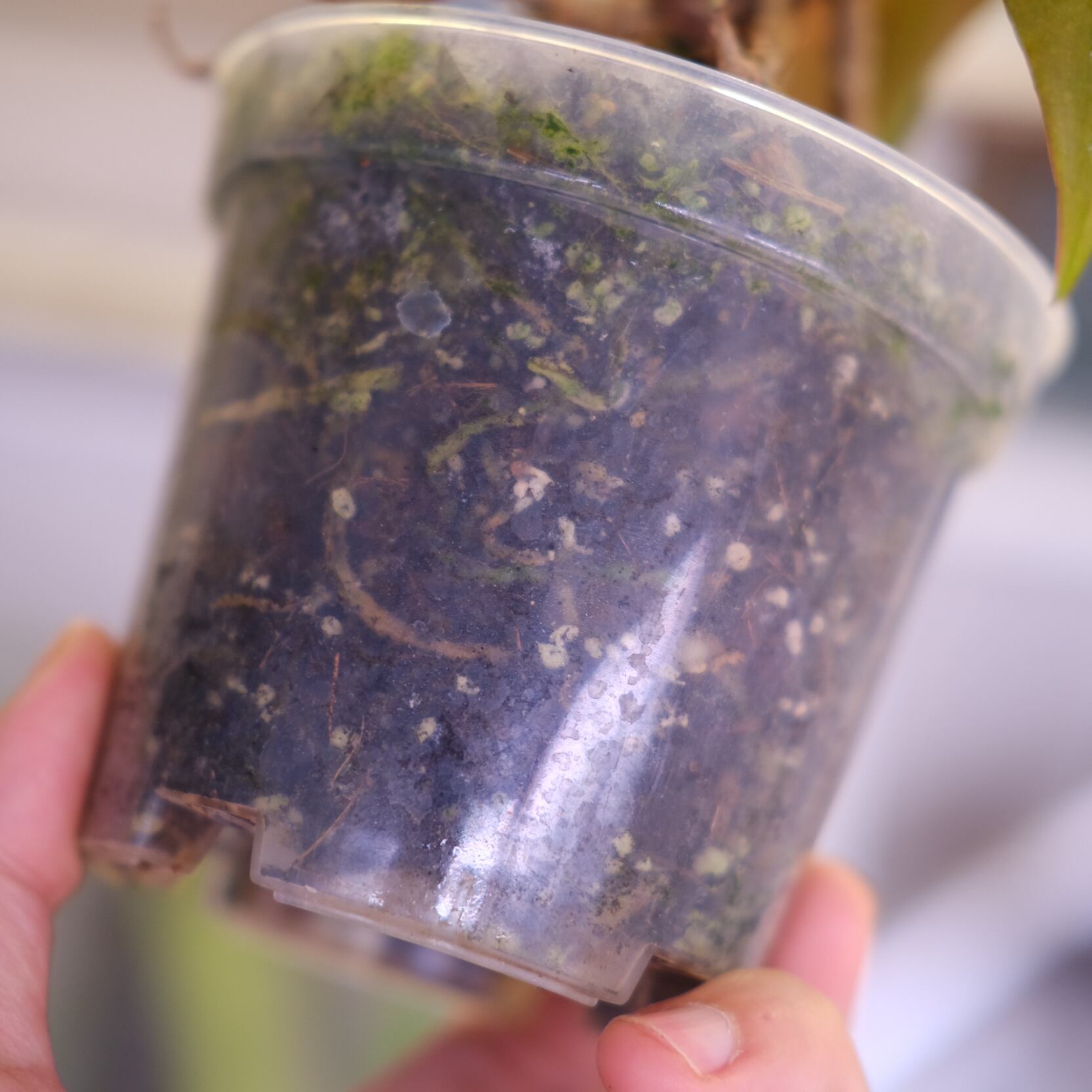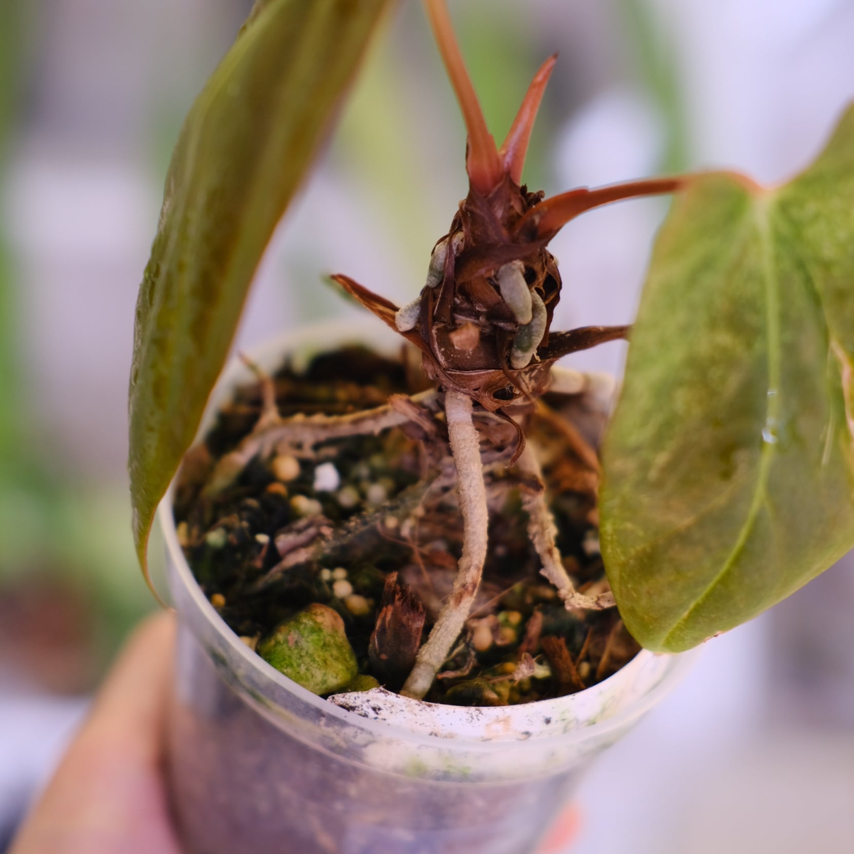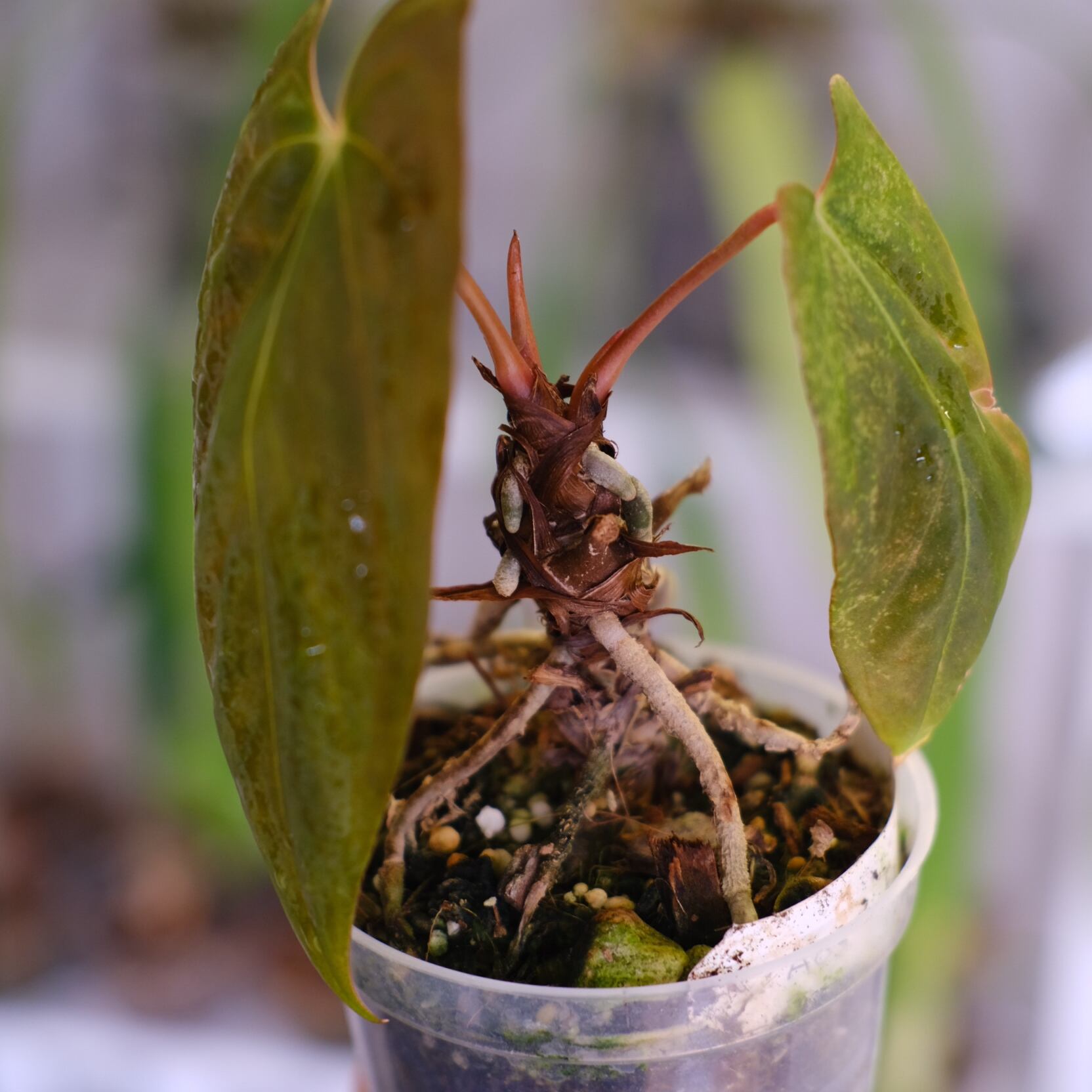 鉢は成長した植物の根を観察できるプラスチック鉢となり、アンスリウムの生育に適した【ココチップ+ひゅうが石】を用土としています。