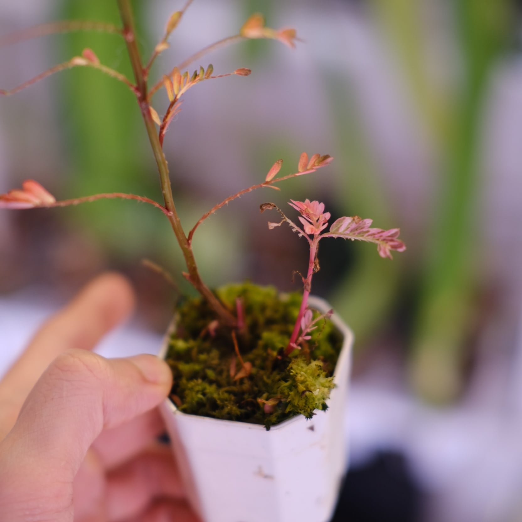 Phyllanthus urinaria 'Pink Variegated'(フィランサス・ウリナリア ピンク斑入り)は、繊細な見た目の美しさとは裏腹に、比較的育てやすい希少植物です。成長しても50cmほどに収まるサイズ感も特徴です。十分な光量・高湿度・20~25度程度の温度環境を保つとピンク色の発色が目立つ新芽が展開します。