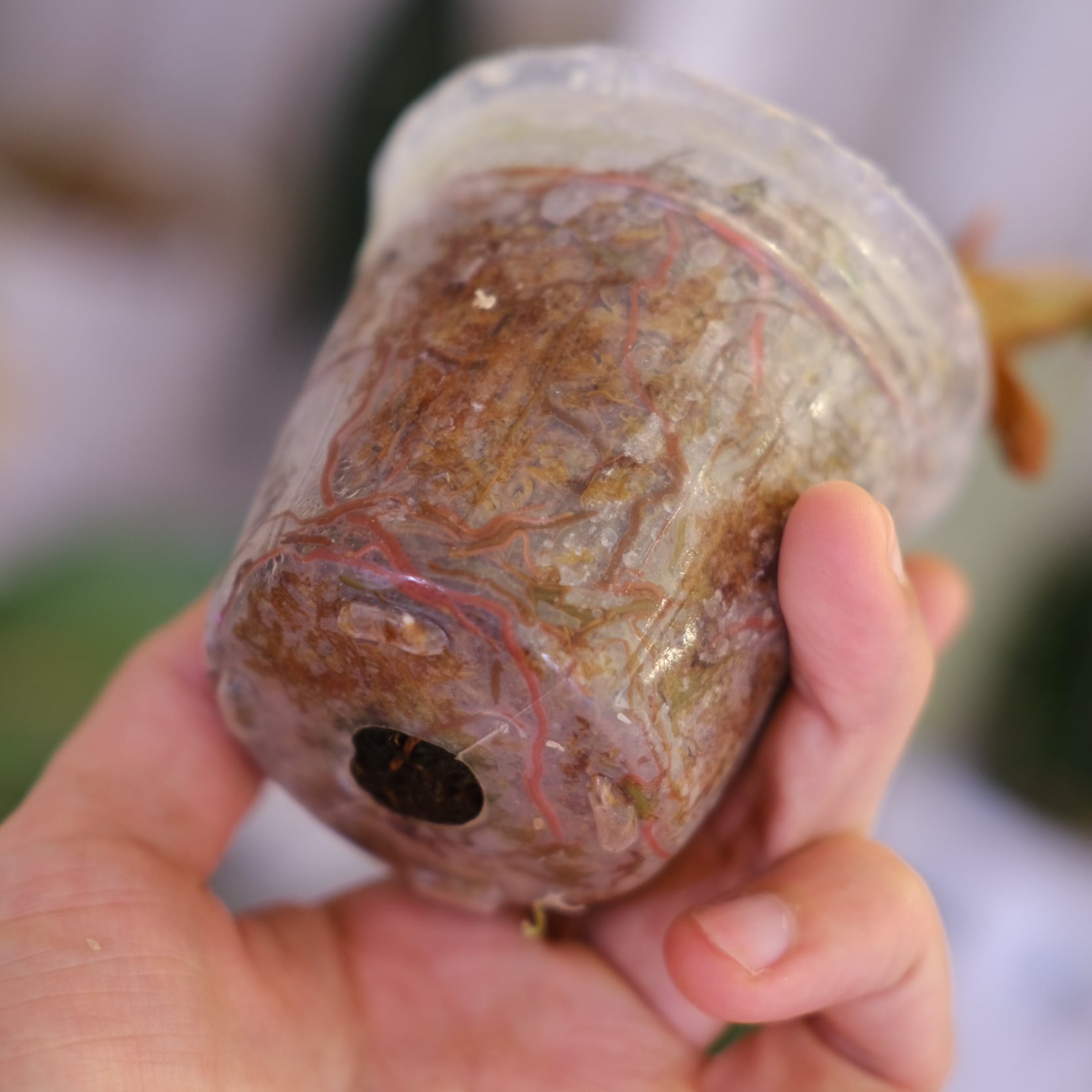鉢は成長した植物の根を観察できるプラスチック鉢となり、生育に適した【水苔】を用土としています。