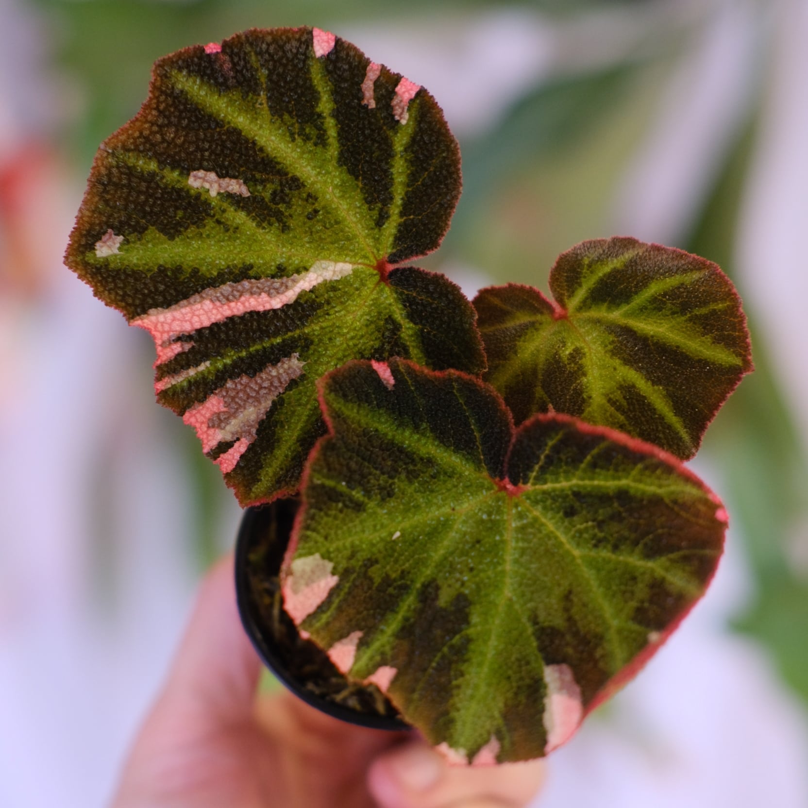 通常の Begonia soli-mutata と同様に、葉には特徴的なクロス模様がありますが、‘Variegated’(斑入り)タイプはさらに珍しく、緑色の葉に白やピンク色の斑が入る美しい品種です。比較的コンパクトに成長をしますが、環境が合えば葉が沢山展開します。
