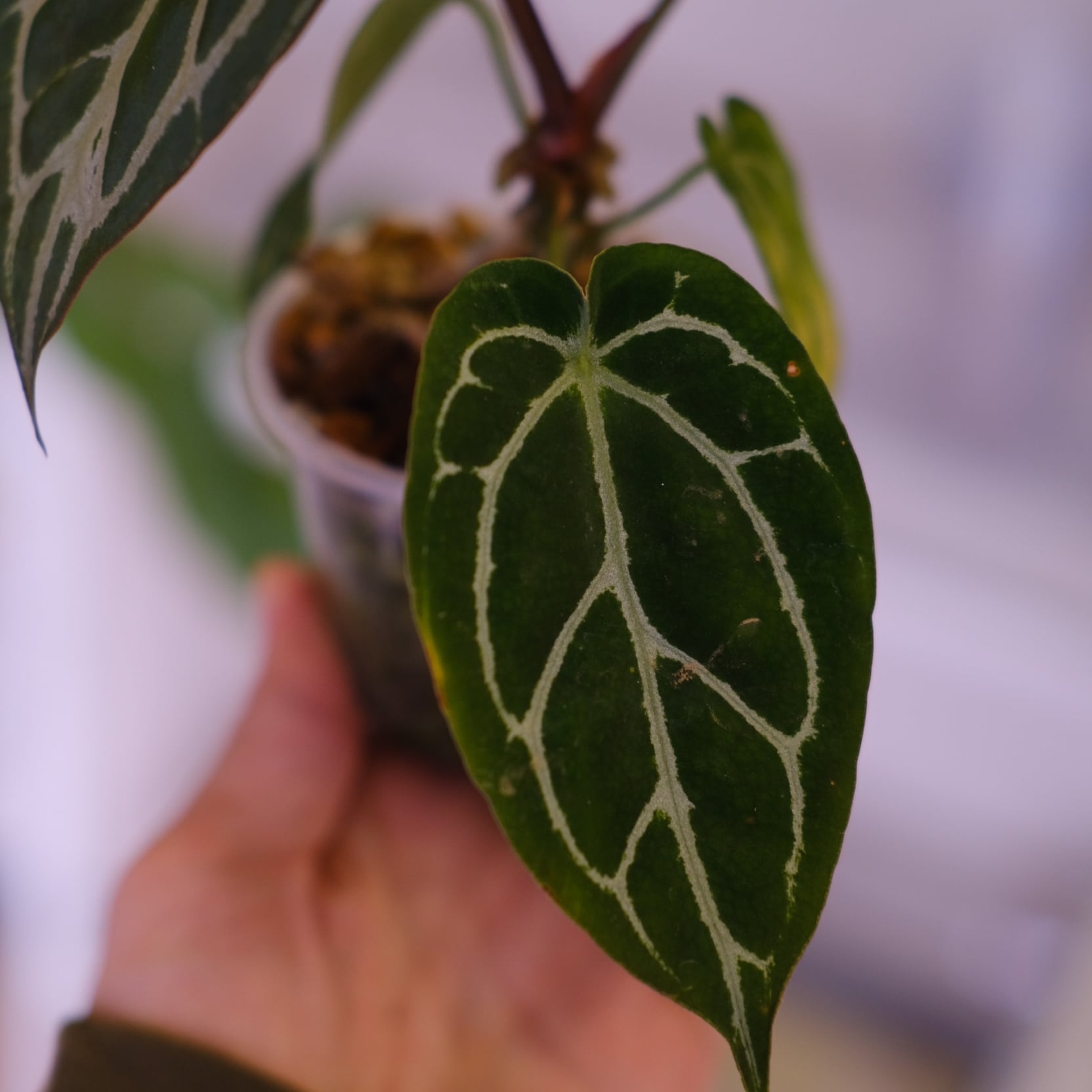 Anthurium chocolate × Anthurium Red crystallinum NSE は、ダークベルベット質と赤脈が組み合わさった交配個体で、両親の特徴がバランス良く現れます。