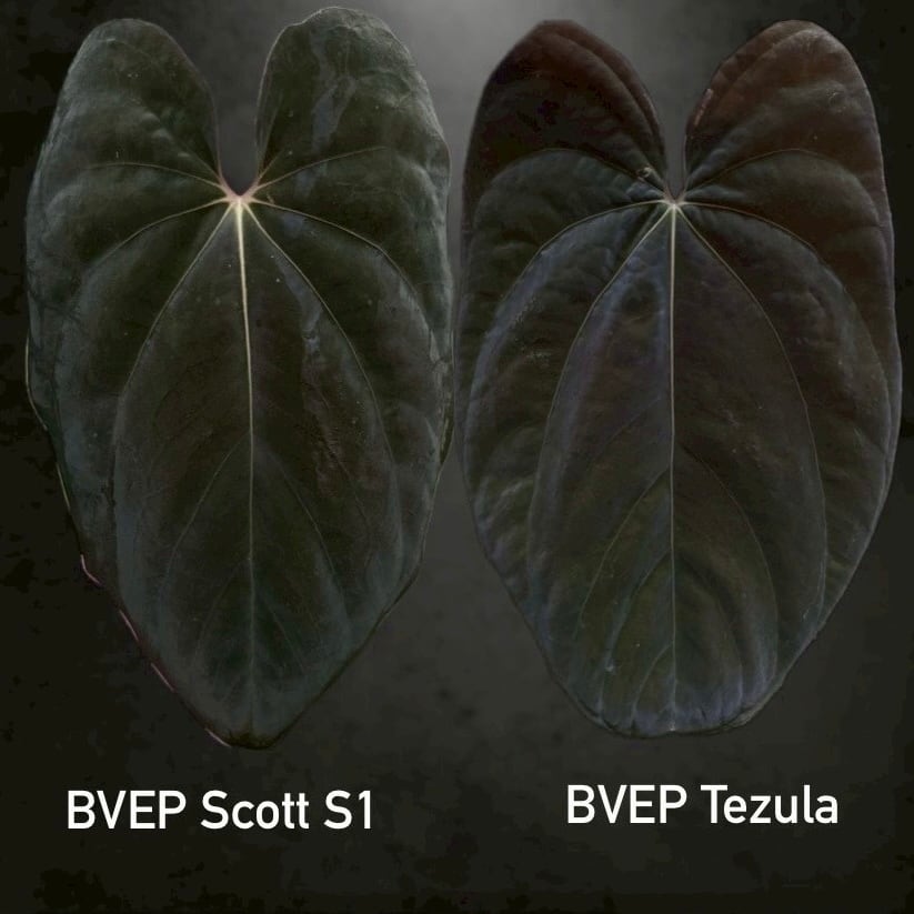 Anthurium BVEP Scott × BVEP Tezula は、育種ライン同士を掛け合わせた交配実生個体で、形質が完全に固定されていない分、個体ごとの表情差が大きい点が特徴です。本株では、ベルベット質の安定性と葉脈の立体感がバランスよく現れています。